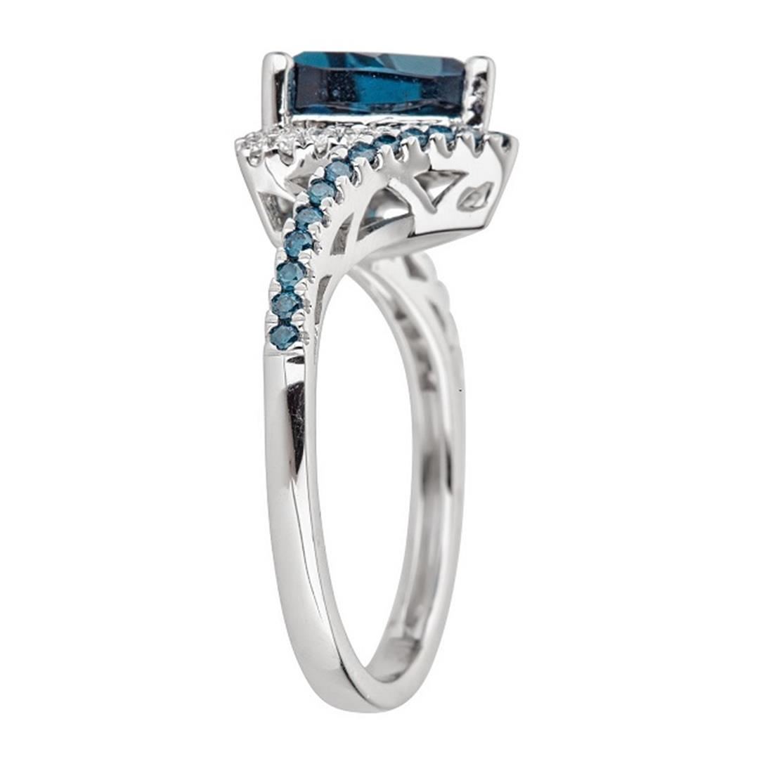 One Ring : 10KT white gold weighing 3.13gm containing one London blue topaz center stone with a total weight of 2.17ct, blue diamonds weighing 0.16ctw, and side diamonds weighing 0.15ctw.