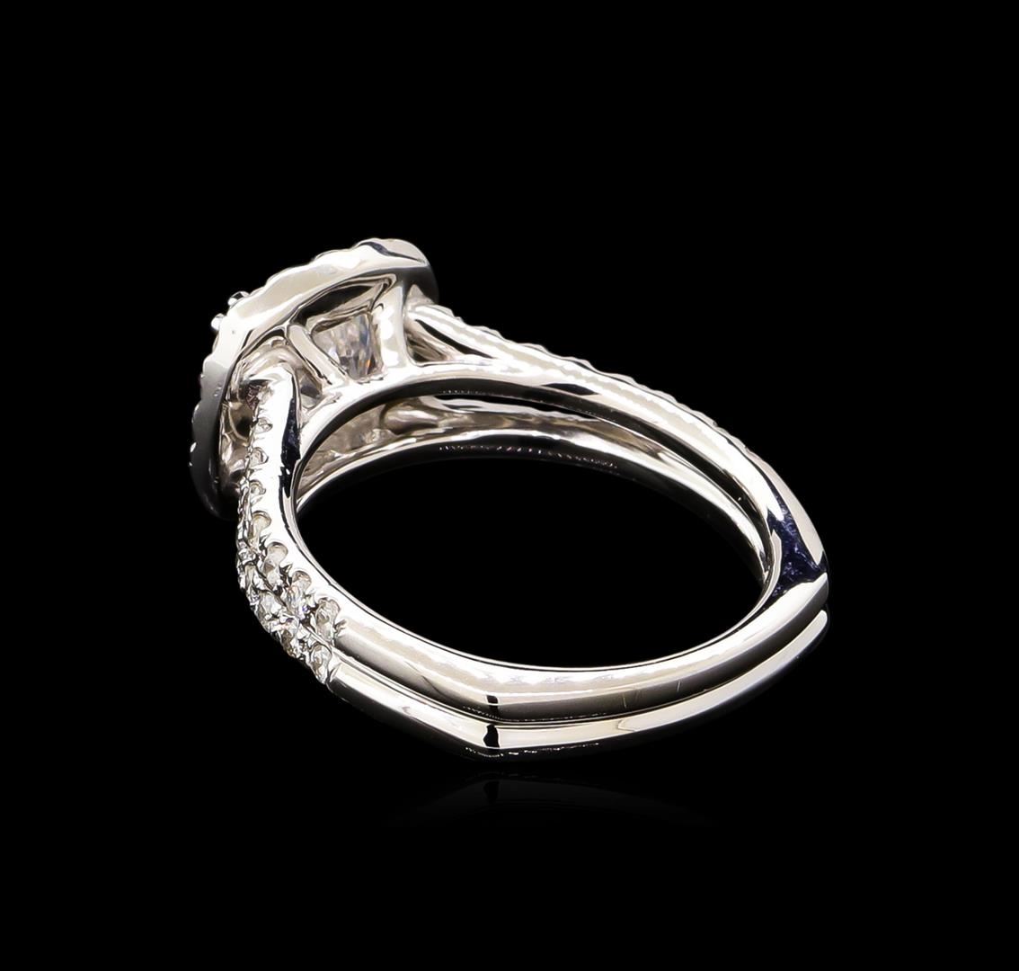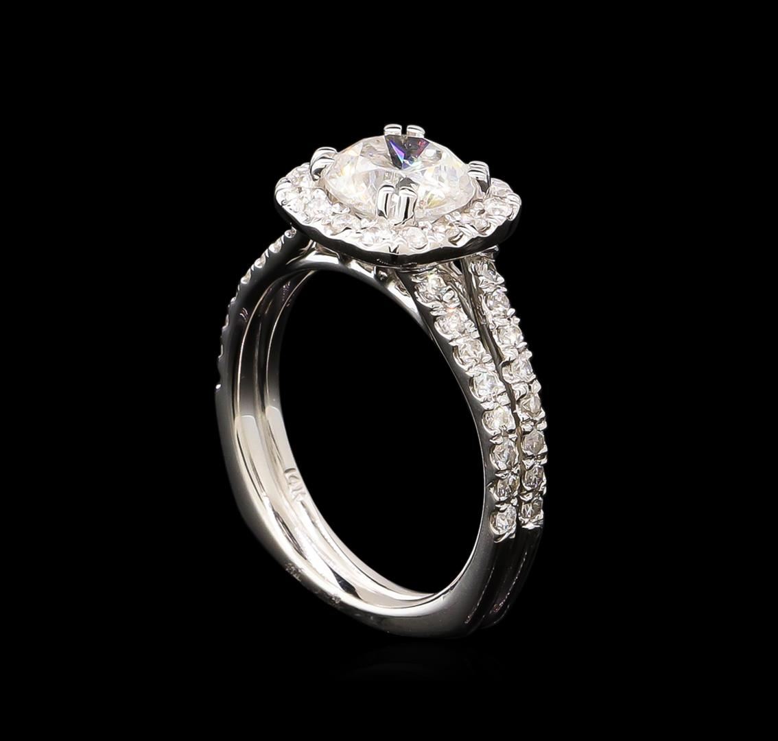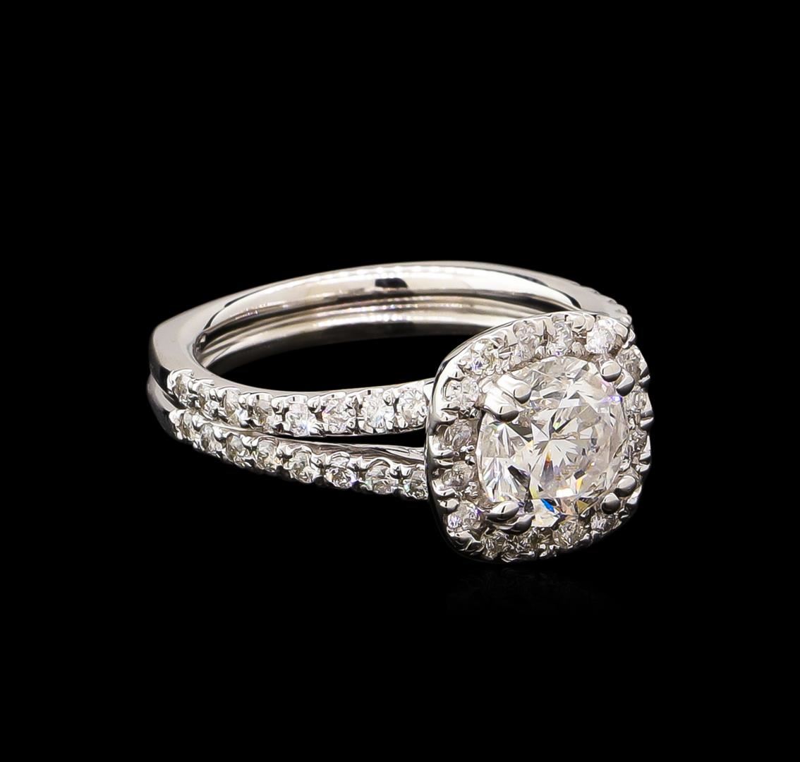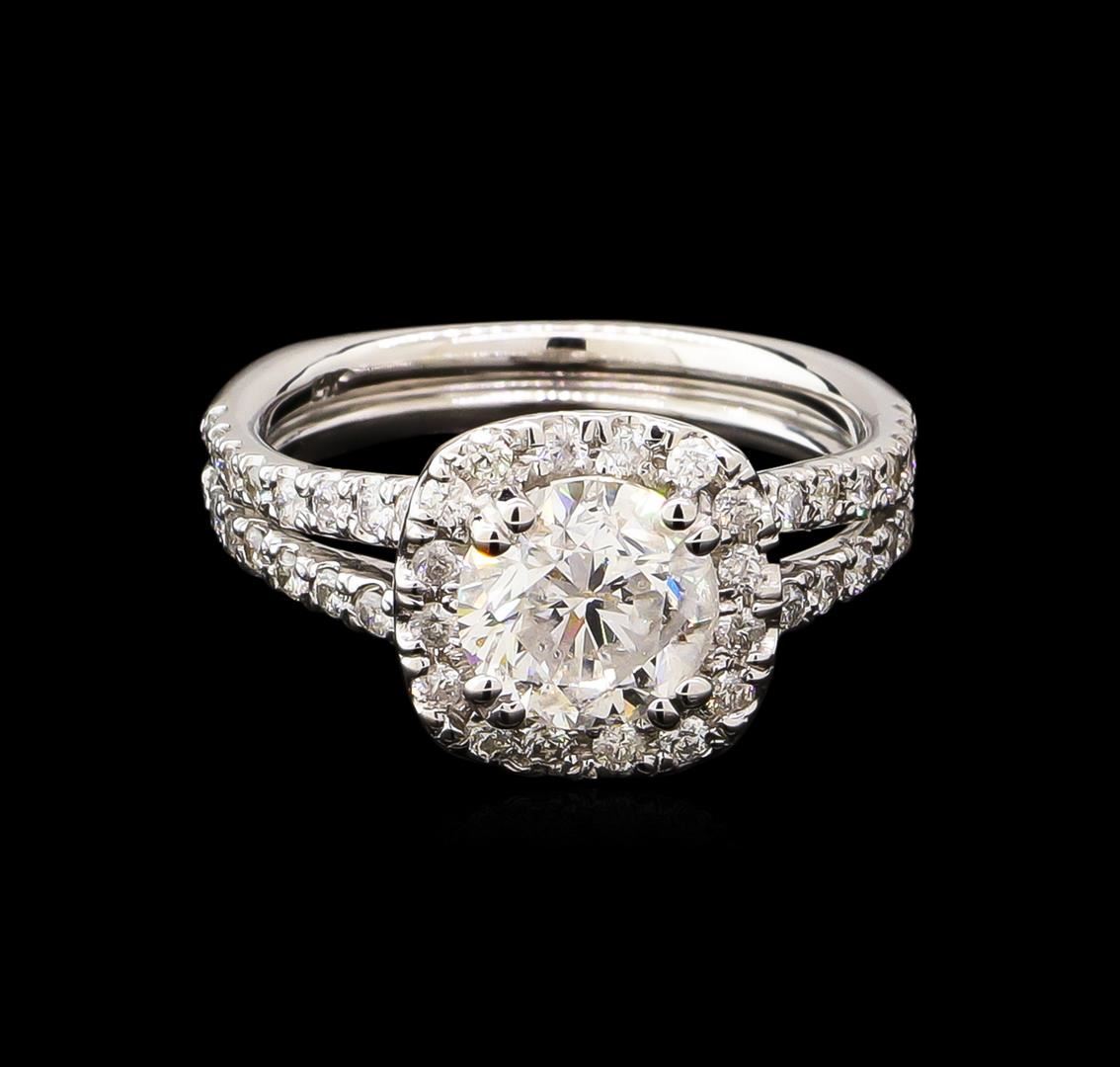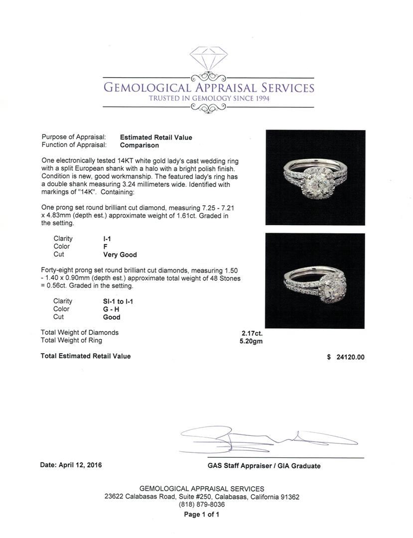 One electronically tested 14KT white gold lady's cast wedding ring with a split European shank with a halo with a bright polish finish. The featured lady's ring has a double shank measuring 3.24 millimeters wide. Identified with markings of "14K". Condition is new, good workmanship. Containing: One prong set round brilliant cut diamond, measuring 7.25 - 7.21 x 4.83mm (depth est.) approximate weight of 1.61ct. Graded in the setting. Clarity: I-1. Color: F. Cut Very Good Forty-Eight prong set round brilliant cut diamonds, measuring 1.50 - 1.40 x 0.90mm (depth est.) approximate total weight of 48 Stones = 0.56ct. Graded in the setting. Clarity: SI-1 to I-1. Color: G - Good. Total Weight of Diamonds 2.17ct. Total Weight of Ring 5.20gm. GAS Appraised at $24,120.00.