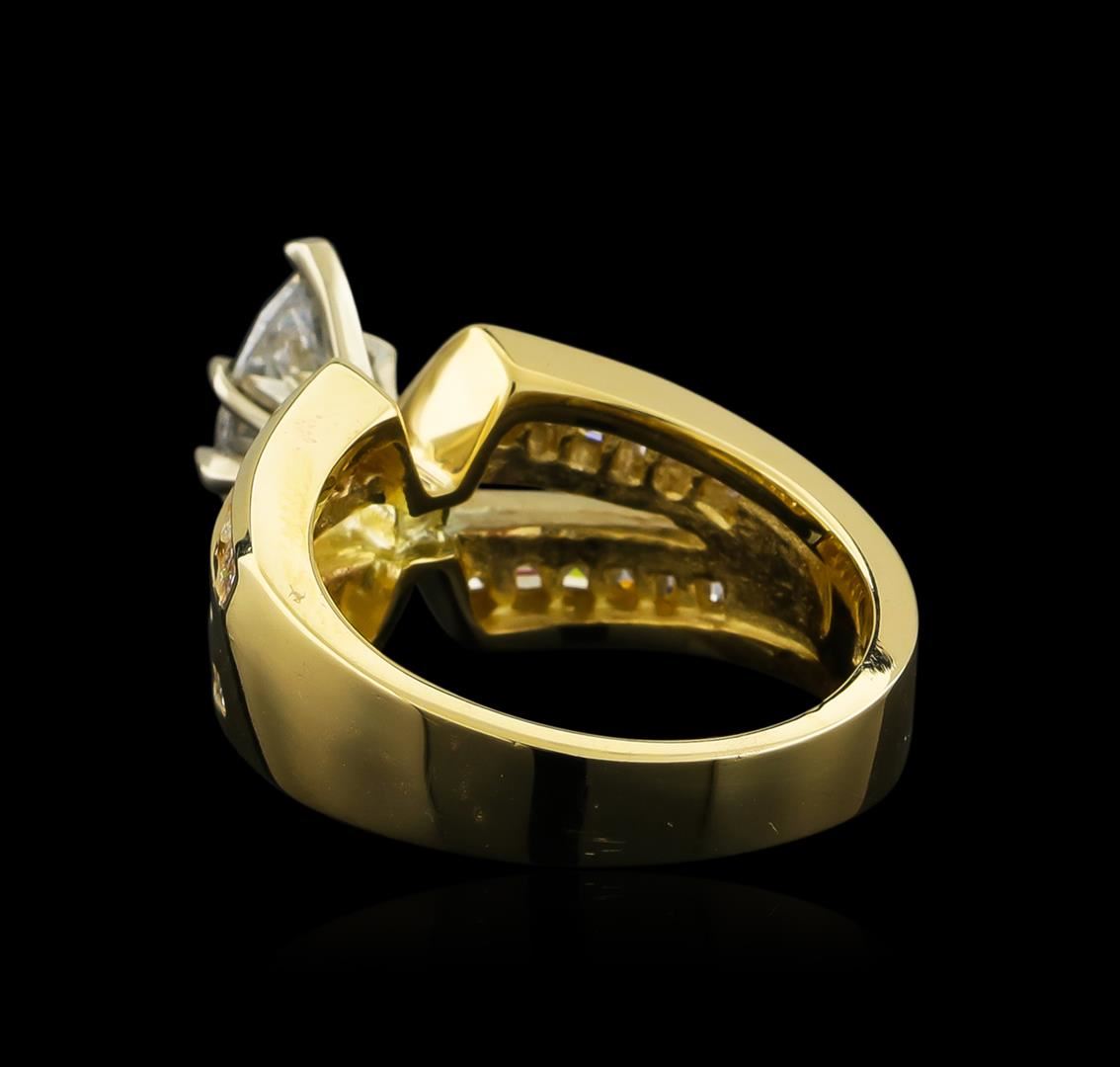 One electronically tested 14KT yellow gold lady's cast wedding ring with a split shank with a bright polish finish. The featured lady's ring has a shank measuring 3.84 millimeters wide. Identified with markings of "14K". Condition is new, good workmanship. Containing: One prong set marquise shaped cut diamond, measuring 10.30 x 5.13 x 3.33mm (depth est.) , 10.00.%. GTCF approximate weight of 1.17ct. Graded in the setting. Clarity: I-1. Color: F - Good Twenty-Four channel set princess cut diamonds, measuring 2.00 x 1.80 x 1.35mm (depth est.) approximate total weight of 24 Stones = 1.00ct. Graded in the setting. Clarity: VS-1 to VS-2. Color: H - I. Cut Very Good. Total Weight of Diamonds 2.17ct. Total Weight of Ring 8.60gm GAS Appraised at $13,935.00.