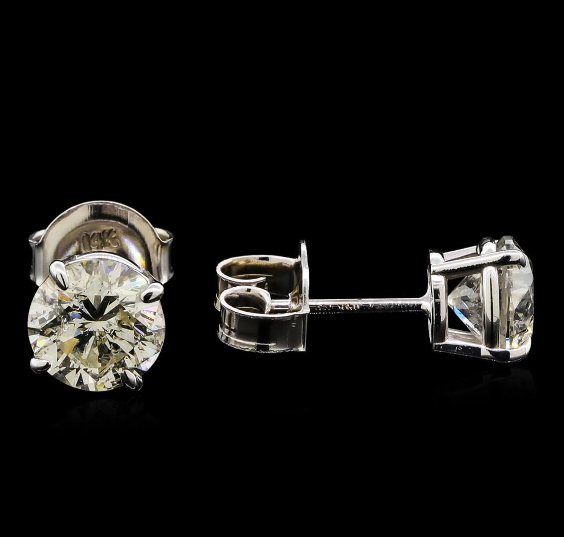 One pair electronically tested 14KT white gold cast & assembled diamond solitaire earrings with standard backs. Bright polish finish. Identified with markings of "14K". Condition is new, good workmanship. Containing: One round brilliant cut diamond, measuring 6.29 - 6.28 x 4.00mm (depth est.), 6.00.%. GTCF approximate weight of 1.10ct. Faint brown secondary color throughout. Graded in the setting. Clarity: I-1. Color: K. Depth 63.6%. Table 58.8%. One prong set round brilliant cut diamond, measuring 6.02 - 6.01 x 4.10mm (depth est.), 8.00.%. GTCF approximate weight of 1.07ct. Faint brown secondary color throughout. Graded in the setting. Clarity: I-2. Color: J. Depth 68.1%. Table 58.1%. Total Weight of Diamonds 2.17ct. Total Weight of Earrings 1.31gm. AIG Appraised at $13,850.00.