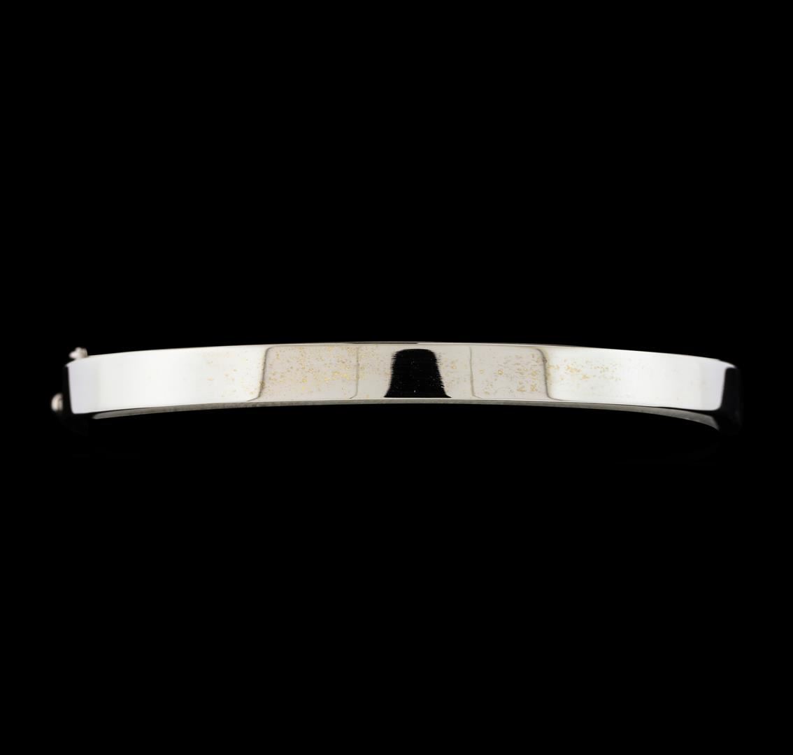 One electronically tested 14KT white gold ladies cast & assembled diamond bangle bracelet. Six and one-half inch length oval bangle bracelet features a diamond set curvature supported by hinged shoulders, completed by a concealed clasp with safety. Bright polish finish. Identified with markings of "14K". Condition is good. Containing: Ninety prong set round brilliant cut diamonds, measuring 1.90 - 1.80 x 1.11mm (depth est.) approximate total weight of 90 Stones = 2.18ct. Graded in the setting. Clarity: SI-2 to I-1. Color: H - J. Total Weight of Diamonds 2.18 ct. Total Weight of Bangle Bracelet 19.57 gm. AIG Appraised at $9,280.00.