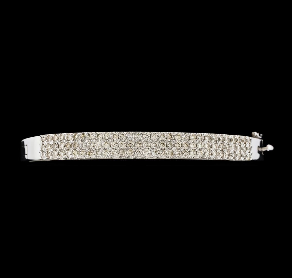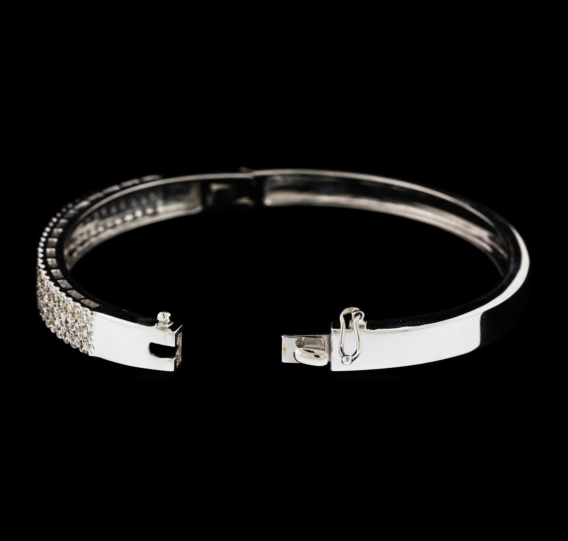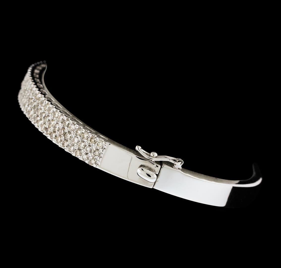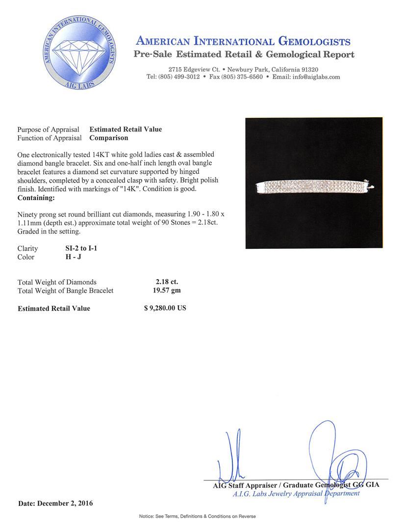 One electronically tested 14KT white gold ladies cast & assembled diamond bangle bracelet. Six and one-half inch length oval bangle bracelet features a diamond set curvature supported by hinged shoulders, completed by a concealed clasp with safety. Bright polish finish. Identified with markings of "14K". Condition is good. Containing: Ninety prong set round brilliant cut diamonds, measuring 1.90 - 1.80 x 1.11mm (depth est.) approximate total weight of 90 Stones = 2.18ct. Graded in the setting. Clarity: SI-2 to I-1. Color: H - J. Total Weight of Diamonds 2.18 ct. Total Weight of Bangle Bracelet 19.57 gm. AIG Appraised at $9,280.00.