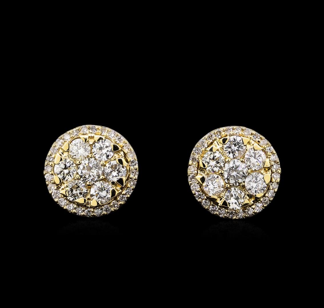 One pair electronically tested 14KT yellow gold lady's combination cast & assembled circle earrings with friction posts with a bright polish finish. Identified with markings of "585". Condition is new, good workmanship. Containing: Two prong set round brilliant cut diamonds, measuring 3.70 - 3.60 x 2.26mm (depth est.) approximate total weight of 2 Stones = 0.36ct. Graded in the setting. Clarity: I-1. Color: H - I. Cut Good Twelve prong set round brilliant cut diamonds, measuring 3.20 - 3.10 x 1.89mm (depth est.) approximate total weight of 12 Stones = 1.34ct. Graded in the setting. Clarity: SI-1 to I-1. Color: H - I. Cut Good Fifty-Six prong set round brilliant cut diamonds, measuring 1.35 - 1.25 x 0.82mm (depth est.) approximate total weight of 56 Stones = 0.48ct. Graded in the setting. Clarity: SI-2 to I-1. Color: H - I. Cut Good. Total Weight of Diamonds 2.18ct. Total Weight of Earrings 7.10gm. GAS Appraised at $6,505.00.