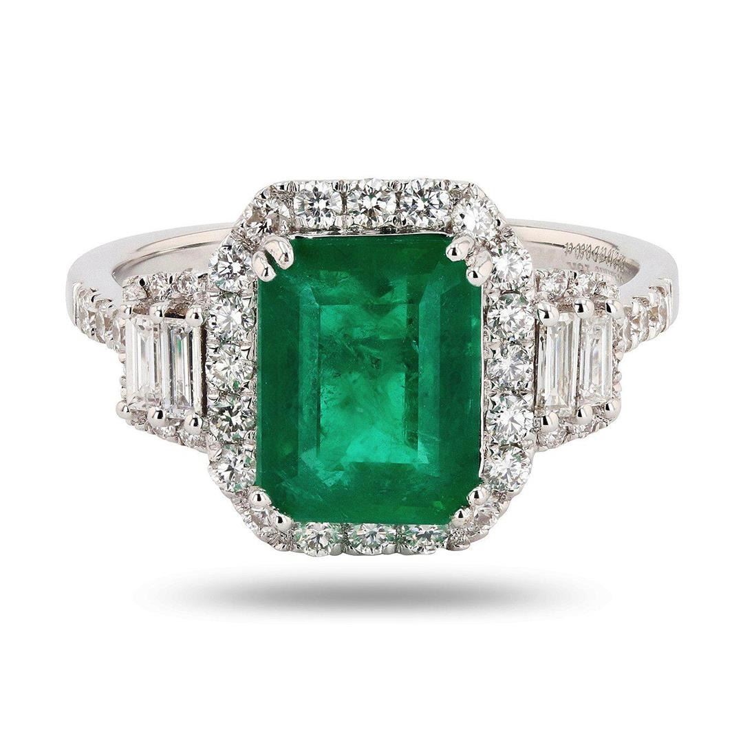 2.18ct Emerald and 0.60ctw Diamond 18K White Gold Ring. One polished, stamped, and tested 18K white gold ring with a bright finish. The ring is mounted with: 1 genuine emerald center stone weighing approximately 2.18 carat, and 42 genuine faceted diamonds weighing approximately 0.60 carats. This item weighs 3.4 grams, condition is new, excellent workmanship. MAIN GEMSTONE Species: Natural Beryl Variety: Emerald Shape: Rectangular Cut Cornered Cutting Style: Step Cut Measurements: 8.5 x 6.5mm Weight: 2.18 carat Color: Green Cut Grade: Very Good Refractive Index: 1.564 - 1.595 DR Birefringence: 0.005 to 0.009 Hardness: 7.5 - 8 ADJACENT GEMSTONES ON RING Identity: Natural Diamond Cut: Baguette / Round Brilliant Quantity: 42 Diamonds Measurements: 3 x 1.5mm (4 baguette) 1.1 - 1.7mm (38 round) Total Weight: 0.60 carats Color Grade: F - G Clarity Grade: VS1 to SI1 Refractive Index: 2.418 Hardness: 10 EMERALD WEIGHT: 2.18ct TOTAL DIAMOND WEIGHT: 0.60ctw WEIGHT OF ITEM: 3.4 grams GOLD CONTENT: 18K White Gold