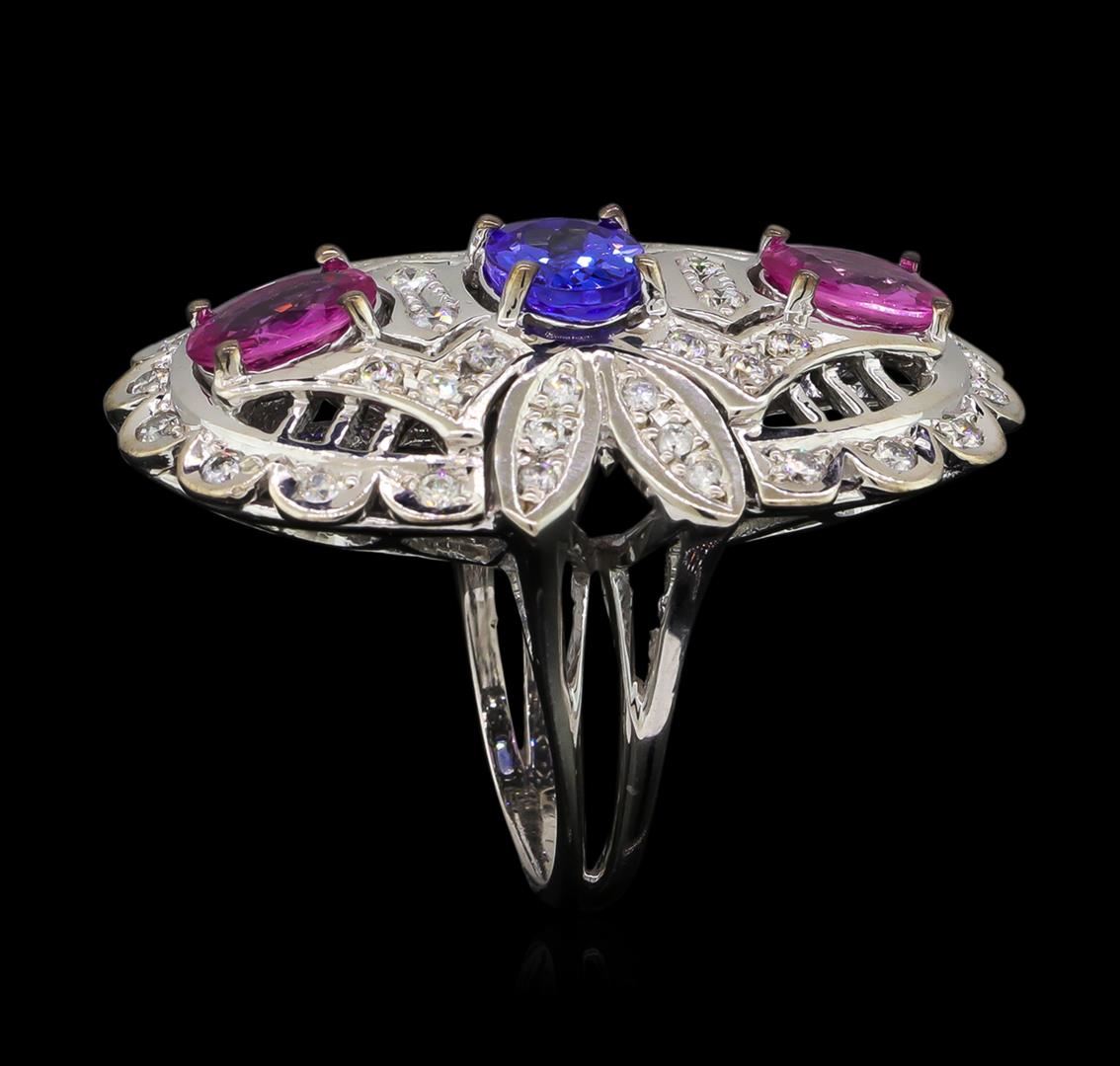 One electronically tested 14KT white gold lady's cast fashion ring with a split shank with a bright polish finish. The featured lady's ring has a shank measuring 2.57 millimeters wide. Identified with markings of "K14". Condition is new, good workmanship. Containing: Two prong set oval modified brilliant cut natural pink sapphires, measuring 7.69 x 5.89 x 2.59mm, 10%. bulge factor, approximate total weight of 2.18ct., clarity is slightly included, type II, medium, very slightly brownish, slightly purplish red color, (GIA slpR 5/3), cut is very good. Colored gemstones are presumed to have been subjected to commonly used enhancement processes. Graded in the setting. One prong set oval modified brilliant cut natural tanzanite, measuring 8.00 x 6.06 x 4.54mm, 5%. bulge factor, approximate weight of 1.60ct., clarity is slightly included, type I, medium, moderately strong, violetish blue color, (GIA vB 5/4), cut is very good. Transmitting light with no distortion, transparent. Colored gemstones are presumed to have been subjected to commonly used enhancement processes. Graded in the setting. Thirty-Two prong set round brilliant cut diamonds, measuring 1.90 - 1.85 x 1.17mm (depth est.) approximate total weight of 32 Stones = 0.80ct. Graded in the setting. Clarity: SI-1 to SI-2. Color: H - Good Twelve prong set round brilliant cut diamonds, measuring 1.50 - 1.45 x 0.92mm (depth est.) approximate total weight of 12 Stones = 0.15ct. Graded in the setting. Clarity: SI-1 to SI-2. Color: H - Good. Total Weight of Colored Stones 3.78ct. Total Weight of Diamonds 0.95ct. Total Weight of Ring 12.50gm. GAS Appraised at $9,930.00.