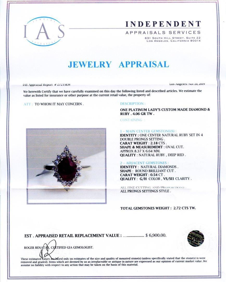 2.18ct Ruby and 0.54ctw Diamond Platinum Ring. DESCRIPTION : ONE PLATINUM LADY'S CUSTOM MADE DIAMOND & RUBY. 4.06 GR TW. CONTAINING: 1 â€" MAIN CENTER GEMSTONE(S) : IDENTITY: ONE CENTER NATURAL RUBY SET IN 4 DOUBLE PRONGS SETTING. CARAT WEIGHT : 2.18 CT. SHAPE & MEASUREMEMT : OVAL CUT. APPROX 8.37 X 6.64 MM. QUALITY : NATURAL RUBY , DEEP RED. 2 - ADIACFNT GEMSTONES : IDENTITY : NATURAL DIAMONDS. SHAPE : ROUND BRILLIANT CUT. CARAT WEIGHT : 0.54 CT. QUALITY : G/H COLOR , VS/SI1 CLARITY. ALL FINE CUTTING AND PROPORTIONS. ALL PRONGS SETTINGS STYLE. TOTAL GEMSTONES WEIGHT : 2.72 CTW TW.