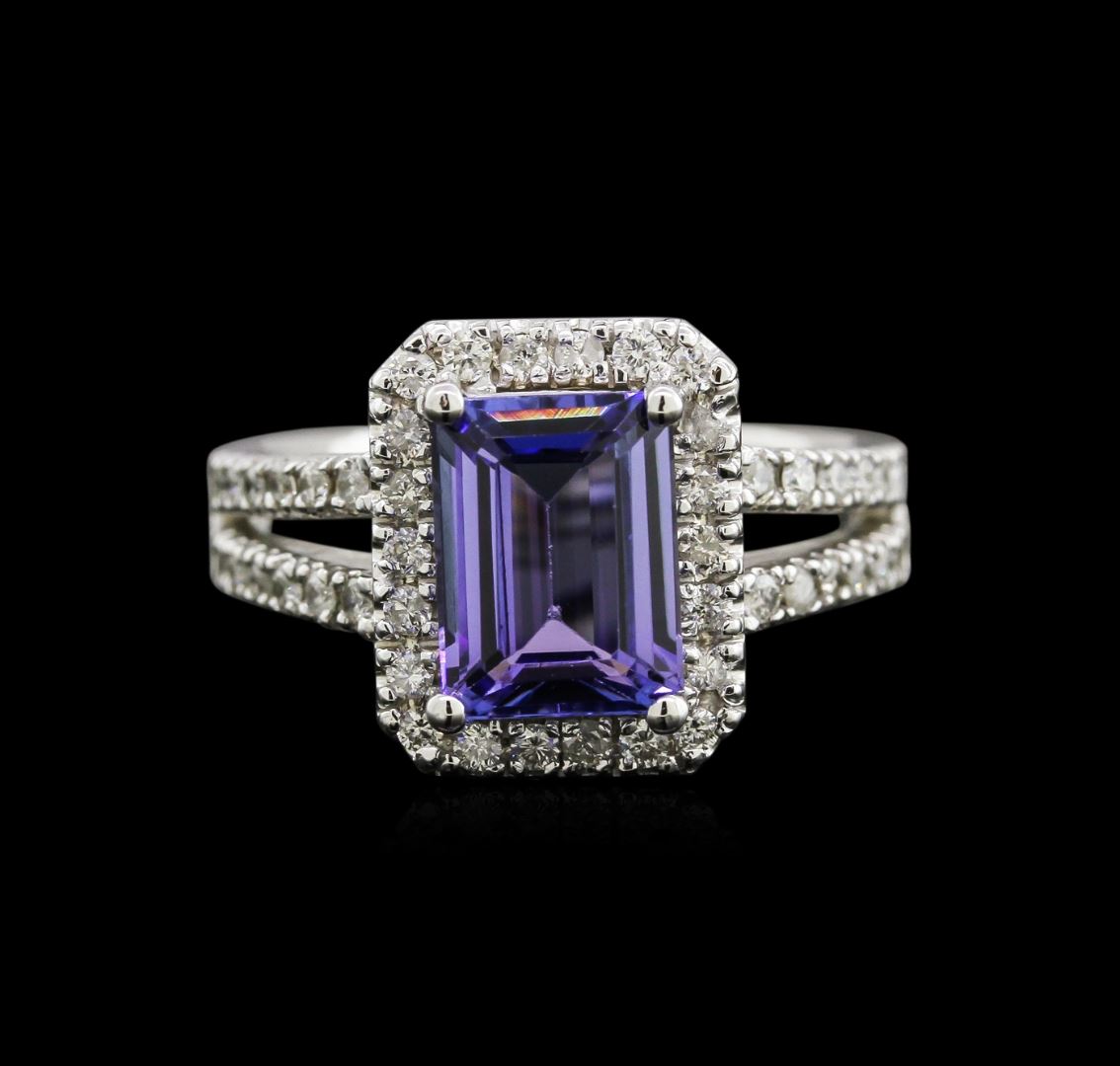 One electronically tested 14KT white gold lady's cast fashion ring with a split shank with a bright polish finish. The featured lady's ring has a halo motif with a 3.50 millimeter wide shank. Identified with markings of "K14". Condition is new, good workmanship. Containing: One prong set emerald step cut natural tanzanite, measuring 9.00 x 6.78 x 3.85mm, approximate weight of 2.18ct., clarity is eye clean, type I, medium, very slightly grayish, violetish blue color, (GIA vB 5/3), cut is very good. Transmitting light with no distortion, transparent. Colored gemstones are presumed to have been subjected to commonly used enhancement processes. Graded in the setting. Forty-Six split prong set round brilliant cut diamonds, measuring 1.40 - 1.35 x 0.90mm (depth est.) approximate total weight of 46 Stones = 0.50ct. Graded in the setting. Clarity: SI-2 to I-1. Color: H - I. Cut Good. Total Weight of Colored Stones 2.18ct. Total Weight of Diamonds 0.50ct. Total Weight of Ring 6.50gm. GAS Appraised at $4,935.00.