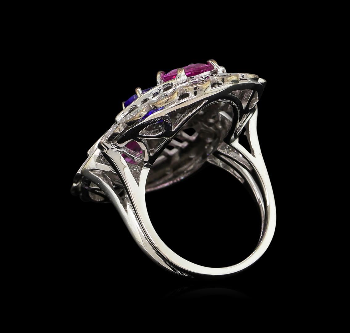 One electronically tested 14KT white gold lady's cast fashion ring with a split shank with a bright polish finish. The featured lady's ring has a shank measuring 2.57 millimeters wide. Identified with markings of "K14". Condition is new, good workmanship. Containing: Two prong set oval modified brilliant cut natural pink sapphires, measuring 7.69 x 5.89 x 2.59mm, 10%. bulge factor, approximate total weight of 2.18ct., clarity is slightly included, type II, medium, very slightly brownish, slightly purplish red color, (GIA slpR 5/3), cut is very good. Colored gemstones are presumed to have been subjected to commonly used enhancement processes. Graded in the setting. One prong set oval modified brilliant cut natural tanzanite, measuring 8.00 x 6.06 x 4.54mm, 5%. bulge factor, approximate weight of 1.60ct., clarity is slightly included, type I, medium, moderately strong, violetish blue color, (GIA vB 5/4), cut is very good. Transmitting light with no distortion, transparent. Colored gemstones are presumed to have been subjected to commonly used enhancement processes. Graded in the setting. Thirty-Two prong set round brilliant cut diamonds, measuring 1.90 - 1.85 x 1.17mm (depth est.) approximate total weight of 32 Stones = 0.80ct. Graded in the setting. Clarity: SI-1 to SI-2. Color: H - Good Twelve prong set round brilliant cut diamonds, measuring 1.50 - 1.45 x 0.92mm (depth est.) approximate total weight of 12 Stones = 0.15ct. Graded in the setting. Clarity: SI-1 to SI-2. Color: H - Good. Total Weight of Colored Stones 3.78ct. Total Weight of Diamonds 0.95ct. Total Weight of Ring 12.50gm. GAS Appraised at $9,930.00.