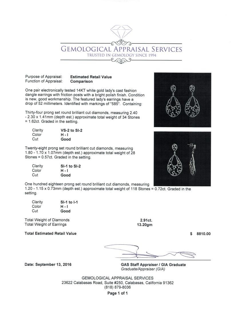 One pair electronically tested 14KT white gold lady's cast fashion dangle earrings with friction posts with a bright polish finish. The featured lady's earrings have a drop of 52 millimeters. Identified with markings of '585'. Condition is new, good workmanship. Containing: Thirty-Four prong set round brilliant cut diamonds, measuring 2.40 - 2.30 x 1.41mm (depth est.) approximate total weight of 34 Stones = 1.62ct. Graded in the setting. Clarity VS-2 to SI-2. Color: H - I Cut Good Twenty-Eight prong set round brilliant cut diamonds, measuring 1.80 - 1.70 x 1.07mm (depth est.) approximate total weight of 28 Stones = 0.57ct. Graded in the setting. Clarity SI-1 to SI-2. Color: H - I Cut Good One Hundred Eighteen prong set round brilliant cut diamonds, measuring 1.20 - 1.15 x 0.73mm (depth est.) approximate total weight of 118 Stones = 0.72ct. Graded in the setting. Clarity SI-1 to I-1. Color: H - I Cut Good. Total Weight of Diamonds 2.91ct.. Total Weight of Earrings 13.20gm GAS Appraised at $8,810.00.