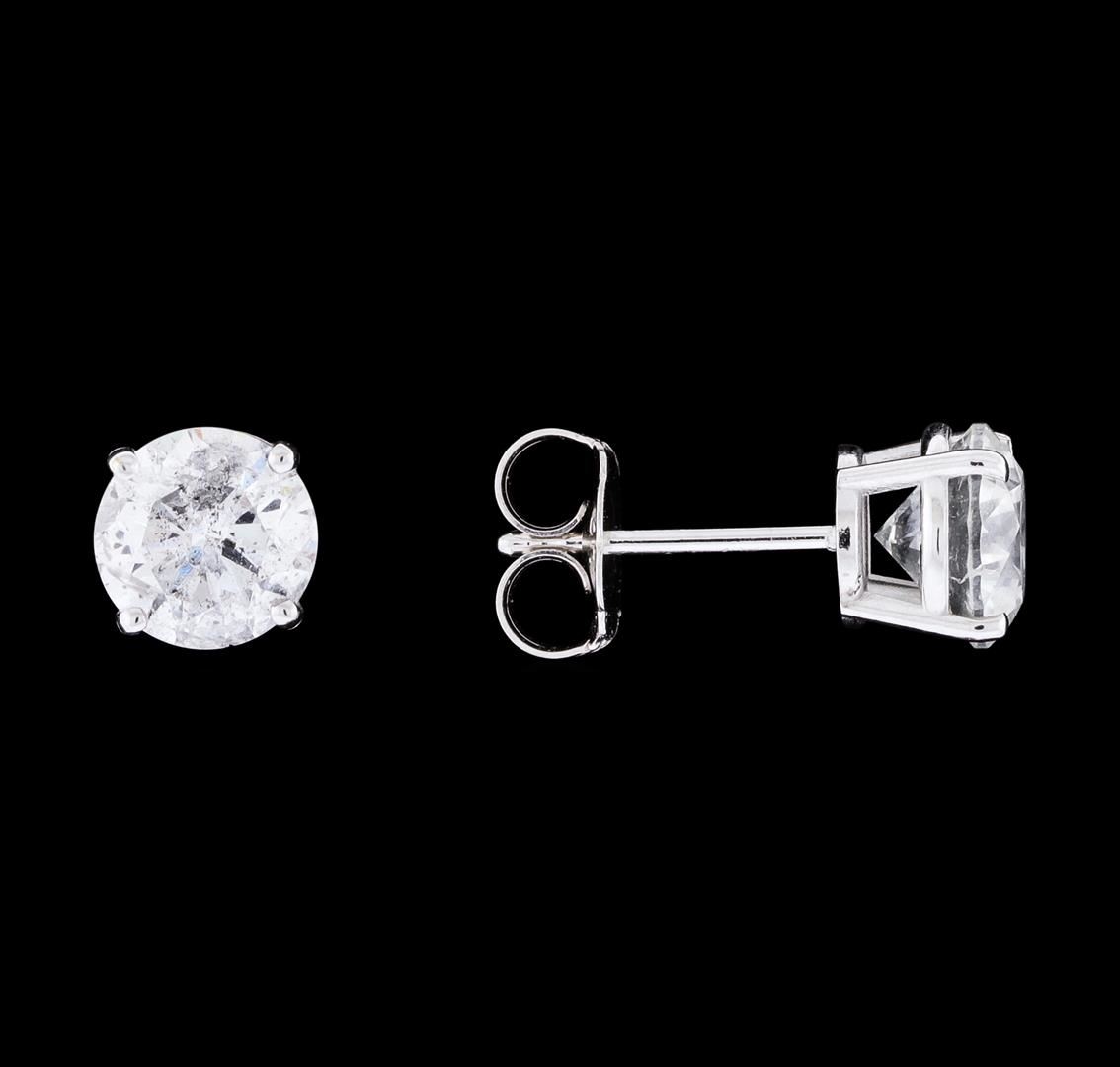 One pair electronically tested 14KT white gold lady's cast stud earrings with friction posts with a basket setting with a bright polish finish. Identified with markings of '14K'. Condition is new, good workmanship. Containing: One prong set round brilliant cut diamond, measuring 6.18 - 6.15 x 4.30mm (depth est.) , 5.00.%. GTCF approximate weight of 1.08ct. Graded in the setting. Clarity I-1. Color: H - I Cut Good One prong set round brilliant cut diamond, measuring 6.22 - 6.15 x 4.40mm (depth est.) , 5.00.%. GTCF approximate weight of 1.11ct. Graded in the setting. Clarity I-2. Color: H Cut Good. Total Weight of Diamonds 2.19ct.. Total Weight of Earrings 1.40gm. GAS Appraised at $9,540.00.