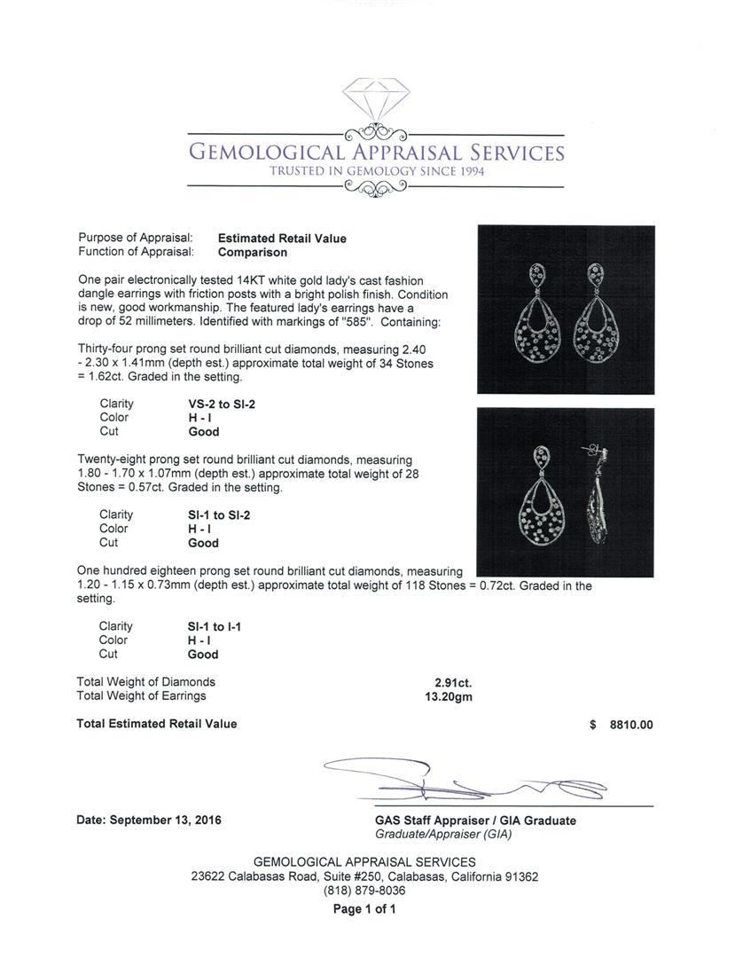 One pair electronically tested 14KT white gold lady's cast fashion dangle earrings with friction posts with a bright polish finish. The featured lady's earrings have a drop of 52 millimeters. Identified with markings of '585'. Condition is new, good workmanship. Containing: Thirty-Four prong set round brilliant cut diamonds, measuring 2.40 - 2.30 x 1.41mm (depth est.) approximate total weight of 34 Stones = 1.62ct. Graded in the setting. Clarity VS-2 to SI-2. Color: H - I Cut Good Twenty-Eight prong set round brilliant cut diamonds, measuring 1.80 - 1.70 x 1.07mm (depth est.) approximate total weight of 28 Stones = 0.57ct. Graded in the setting. Clarity SI-1 to SI-2. Color: H - I Cut Good One Hundred Eighteen prong set round brilliant cut diamonds, measuring 1.20 - 1.15 x 0.73mm (depth est.) approximate total weight of 118 Stones = 0.72ct. Graded in the setting. Clarity SI-1 to I-1. Color: H - I Cut Good. Total Weight of Diamonds 2.91ct.. Total Weight of Earrings 13.20gm GAS Appraised.