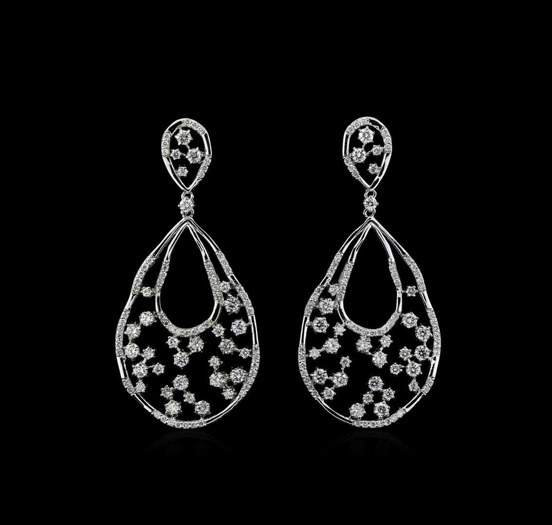 One pair electronically tested 14KT white gold lady's cast fashion dangle earrings with friction posts with a bright polish finish. The featured lady's earrings have a drop of 52 millimeters. Identified with markings of '585'. Condition is new, good workmanship. Containing: Thirty-Four prong set round brilliant cut diamonds, measuring 2.40 - 2.30 x 1.41mm (depth est.) approximate total weight of 34 Stones = 1.62ct. Graded in the setting. Clarity VS-2 to SI-2. Color: H - I Cut Good Twenty-Eight prong set round brilliant cut diamonds, measuring 1.80 - 1.70 x 1.07mm (depth est.) approximate total weight of 28 Stones = 0.57ct. Graded in the setting. Clarity SI-1 to SI-2. Color: H - I Cut Good One Hundred Eighteen prong set round brilliant cut diamonds, measuring 1.20 - 1.15 x 0.73mm (depth est.) approximate total weight of 118 Stones = 0.72ct. Graded in the setting. Clarity SI-1 to I-1. Color: H - I Cut Good. Total Weight of Diamonds 2.91ct.. Total Weight of Earrings 13.20gm GAS Appraised.