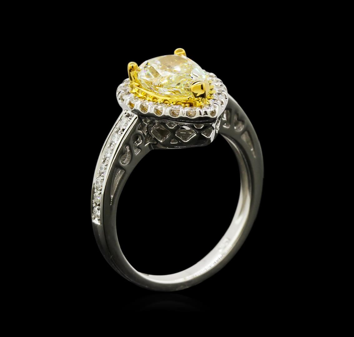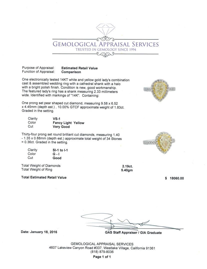 One electronically tested 14KT white and yellow gold lady's combination cast & assembled wedding ring with a cathedral shank with a halo with a bright polish finish. The featured lady's ring has a shank measuring 2.33 millimeters wide. Identified with markings of "14K". Condition is new, good workmanship. Containing: One prong set pear shaped cut diamond, measuring 9.58 x 6.52 x 4.45mm (depth est.) , 10.00.%. GTCF approximate weight of 1.83ct. Graded in the setting. Clarity: VS-1 Cut Very Good Thirty-Four prong set round brilliant cut diamonds, measuring 1.40 - 1.35 x 0.88mm (depth est.) approximate total weight of 34 Stones = 0.36ct. Graded in the setting. Clarity: SI-1 to I-1. Color: G - I. Cut Good. Total Weight of Diamonds 2.19ct. Total Weight of Ring 5.40gm. GAS Appraised at $18,060.00.