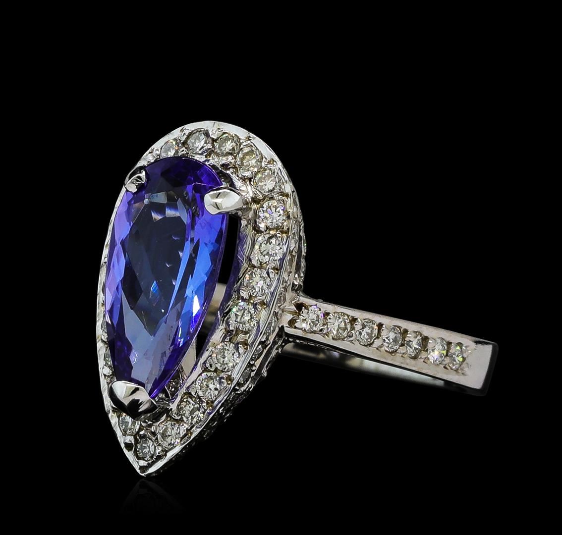 One electronically tested 14KT white gold ladies cast tanzanite and diamond ring with a bright polish finish. The featured tanzanite is set within a diamond bezel supported by a diamond set lattice under gallery and diamond set shoulders, completed by a two and one-half millimeter wide band. Identified with markings of '14K'. Condition is new, good workmanship. Containing: One prong set pear mixed cut natural tanzanite, measuring 12.50 x 6.30 x 4.00mm, 4%. bulge factor, approximate weight of 2.19ct., clarity is eye clean, type I, medium, very slightly grayish, bluish violet color, (GIA bV 5/3), cut is good. Transmitting light with no distortion, transparent. Colored Stone Grading Report attached. Graded in the setting. Tanzanite is a very rare gemstone that is only found in the country of Tanzania. Originally discovered in 1967. Tiffany & Company, named the stone Tanzanite. It is found in the Usumburu Mountains that border the Umba Valley of northern Tanzania. Tanzanite occurs in gray, brown, violet, blue, reddish-purple, & green. The gem is interesting because of its exceptional pleochroism. Rotated in different directions a tanzanite will exhibit multiple changes of color. Tanzanite has a low tolerance to ultrasonic cleaning, and should not be cleaned using this method. Eighty-Seven prong set round brilliant cut diamonds, measuring 1.50 - 1.30 x 0.84mm (depth est.) approximate total weight of 87 Stones = 0.92ct. The clarity grade reflects the entire range of clarity for this group. Graded in the setting. Clarity SI-1 to I-2. Color: F - H. Total Weight of Colored Stones 2.19ct.. Total Weight of Diamonds 0.92ct.. Total Weight of Ring 5.29gm. AIG Appraised at $7,690.00.