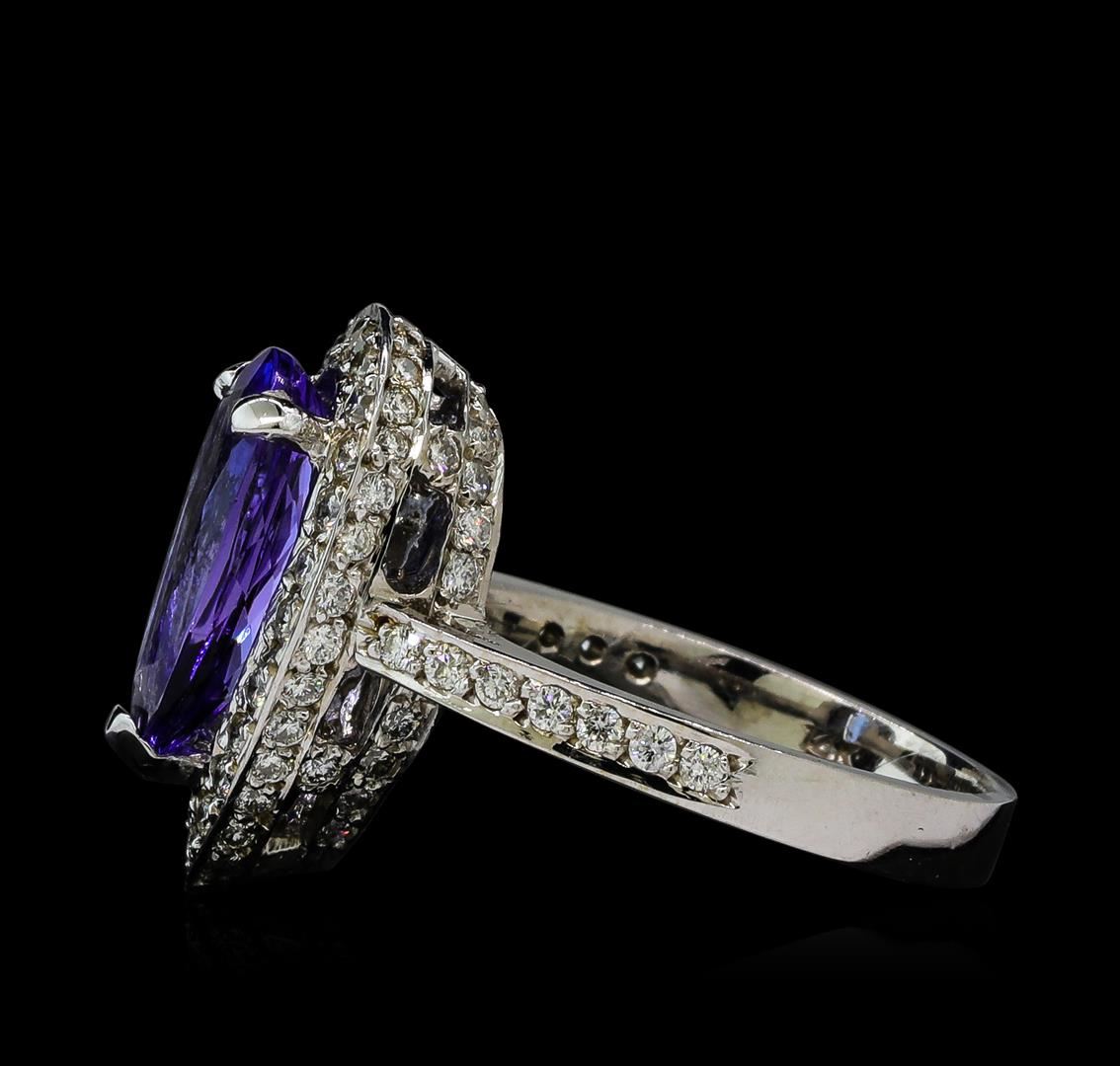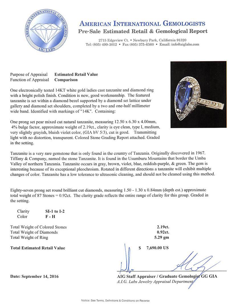 One electronically tested 14KT white gold ladies cast tanzanite and diamond ring with a bright polish finish. The featured tanzanite is set within a diamond bezel supported by a diamond set lattice under gallery and diamond set shoulders, completed by a two and one-half millimeter wide band. Identified with markings of '14K'. Condition is new, good workmanship. Containing: One prong set pear mixed cut natural tanzanite, measuring 12.50 x 6.30 x 4.00mm, 4%. bulge factor, approximate weight of 2.19ct., clarity is eye clean, type I, medium, very slightly grayish, bluish violet color, (GIA bV 5/3), cut is good. Transmitting light with no distortion, transparent. Colored Stone Grading Report attached. Graded in the setting. Tanzanite is a very rare gemstone that is only found in the country of Tanzania. Originally discovered in 1967. Tiffany & Company, named the stone Tanzanite. It is found in the Usumburu Mountains that border the Umba Valley of northern Tanzania. Tanzanite occurs in gray, brown, violet, blue, reddish-purple, & green. The gem is interesting because of its exceptional pleochroism. Rotated in different directions a tanzanite will exhibit multiple changes of color. Tanzanite has a low tolerance to ultrasonic cleaning, and should not be cleaned using this method. Eighty-Seven prong set round brilliant cut diamonds, measuring 1.50 - 1.30 x 0.84mm (depth est.) approximate total weight of 87 Stones = 0.92ct. The clarity grade reflects the entire range of clarity for this group. Graded in the setting. Clarity SI-1 to I-2. Color: F - H. Total Weight of Colored Stones 2.19ct.. Total Weight of Diamonds 0.92ct.. Total Weight of Ring 5.29gm. AIG Appraised at $7,690.00.