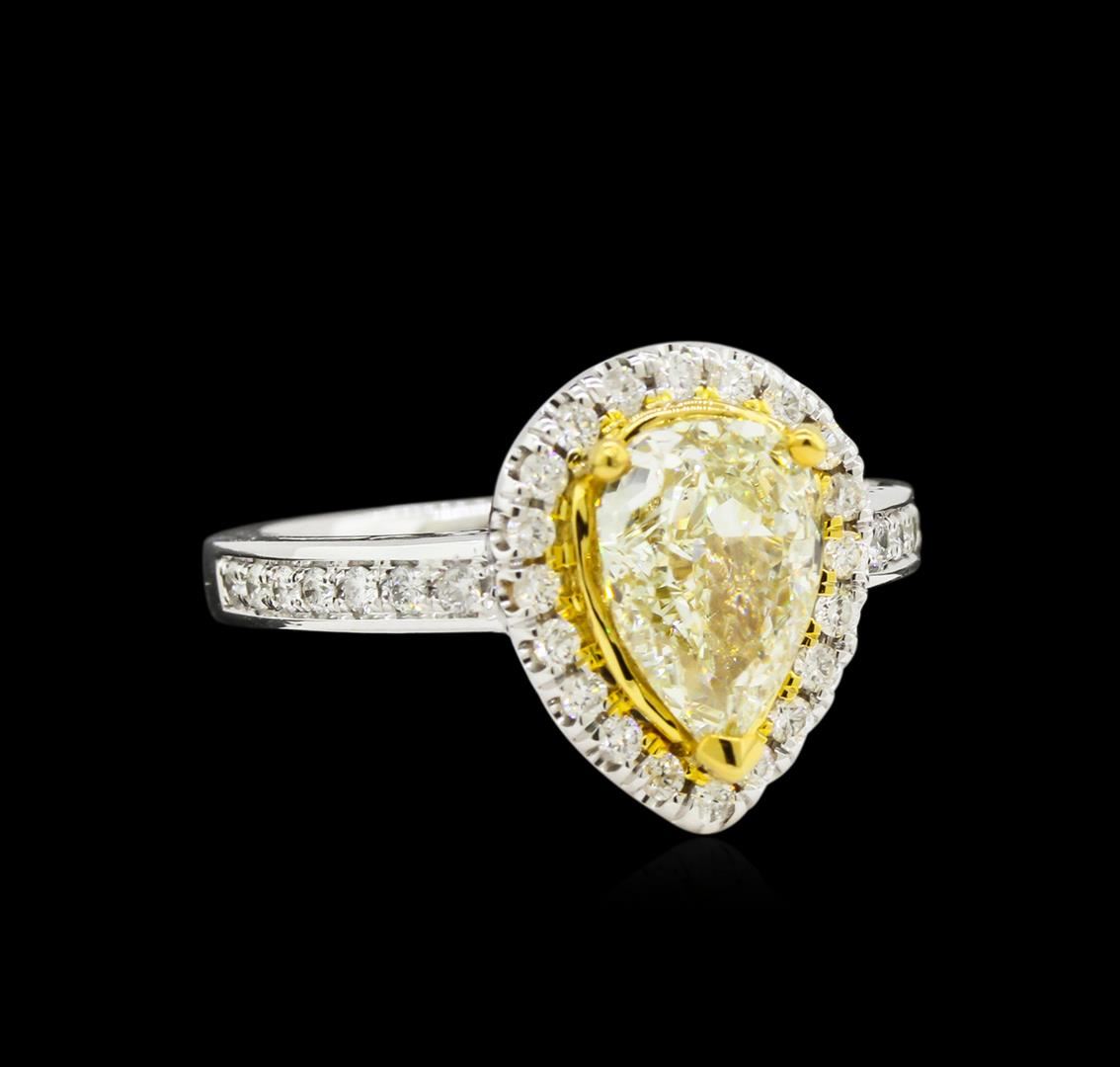 One electronically tested 14KT white and yellow gold lady's combination cast & assembled wedding ring with a cathedral shank with a halo with a bright polish finish. The featured lady's ring has a shank measuring 2.33 millimeters wide. Identified with markings of "14K". Condition is new, good workmanship. Containing: One prong set pear shaped cut diamond, measuring 9.58 x 6.52 x 4.45mm (depth est.) , 10.00.%. GTCF approximate weight of 1.83ct. Graded in the setting. Clarity: VS-1 Cut Very Good Thirty-Four prong set round brilliant cut diamonds, measuring 1.40 - 1.35 x 0.88mm (depth est.) approximate total weight of 34 Stones = 0.36ct. Graded in the setting. Clarity: SI-1 to I-1. Color: G - I. Cut Good. Total Weight of Diamonds 2.19ct. Total Weight of Ring 5.40gm. GAS Appraised at $18,060.00.