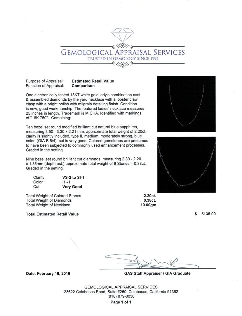 One electronically tested 18KT white gold lady's combination cast & assembled diamonds by the yard necklace with a lobster claw clasp with a bright polish with milgrain detailing finish. The featured ladies' necklace measures 25 inches in length. Trademark is MICHA. Identified with markings of "18K 750". Condition is new, good workmanship. Containing: Ten bezel set round modified brilliant cut natural blue sapphires, measuring 3.50 - 3.30 x 2.21 mm, approximate total weight of 2.20ct., clarity is slightly included, type II, medium, moderately strong, blue color, (GIA B 5/4), cut is very good. Colored gemstones are presumed to have been subjected to commonly used enhancement processes. Graded in the setting. Nine bezel set round brilliant cut diamonds, measuring 2.30 - 2.20 x 1.35mm (depth est.) approximate total weight of 9 Stones = 0.38ct. Graded in the setting. Clarity: VS-2 to SI-1. Color: H - I. Cut Very Good. Total Weight of Colored Stones 2.20ct. Total Weight of Diamonds 0.38ct. Total Weight of Necklace 10.00gm. GAS Appraised at $5,135.00.