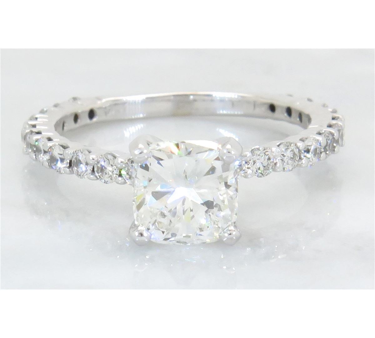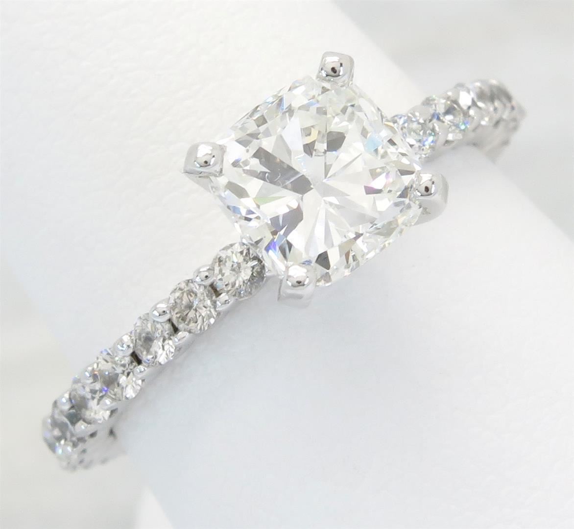 One tested 14K white gold diamond ring. Containing: One GSI Certified Cushion Cut Diamond. Size: 1.61CT, Clarity: I1, Color: H. 22 Round Brilliant Cut Diamonds. Approximate total diamond weight: 2.20CTW. All diamonds are graded in the mounting unless otherwise stated. Weight of ring: 3.4 grams, Size: 7.0. GSI Appraised.
