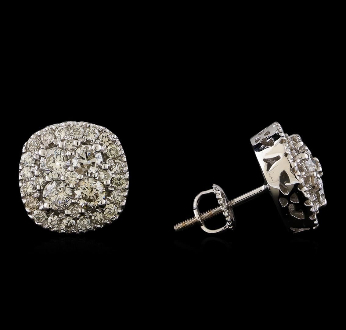 One pair electronically tested 14KT white gold cast & assembled diamond earrings with screw backs. Each earring features an organized diamond cluster set within a diamond bezel and supported by a lattice under gallery. Bright polish finish. Identified with markings of "14K". Condition is new, good workmanship. Containing: Eight prong set round brilliant cut diamonds, measuring 3.50 - 3.40 x 2.07mm (depth est.) approximate total weight of 8 Stones = 1.30ct. Graded in the setting. Clarity: SI-2 to I-1. Color: H - J Fifty prong set round brilliant cut diamonds, measuring 1.70 - 1.60 x 0.99mm (depth est.) approximate total weight of 50 Stones = 0.90ct. The color grade reflects the entire range of color for this group. Graded in the setting. Clarity: SI-1 to I-1. Color: G - J. Total Weight of Diamonds 2.20ct. Total Weight of Earrings 5.55gm. AIG Appraised at $7,470.00.