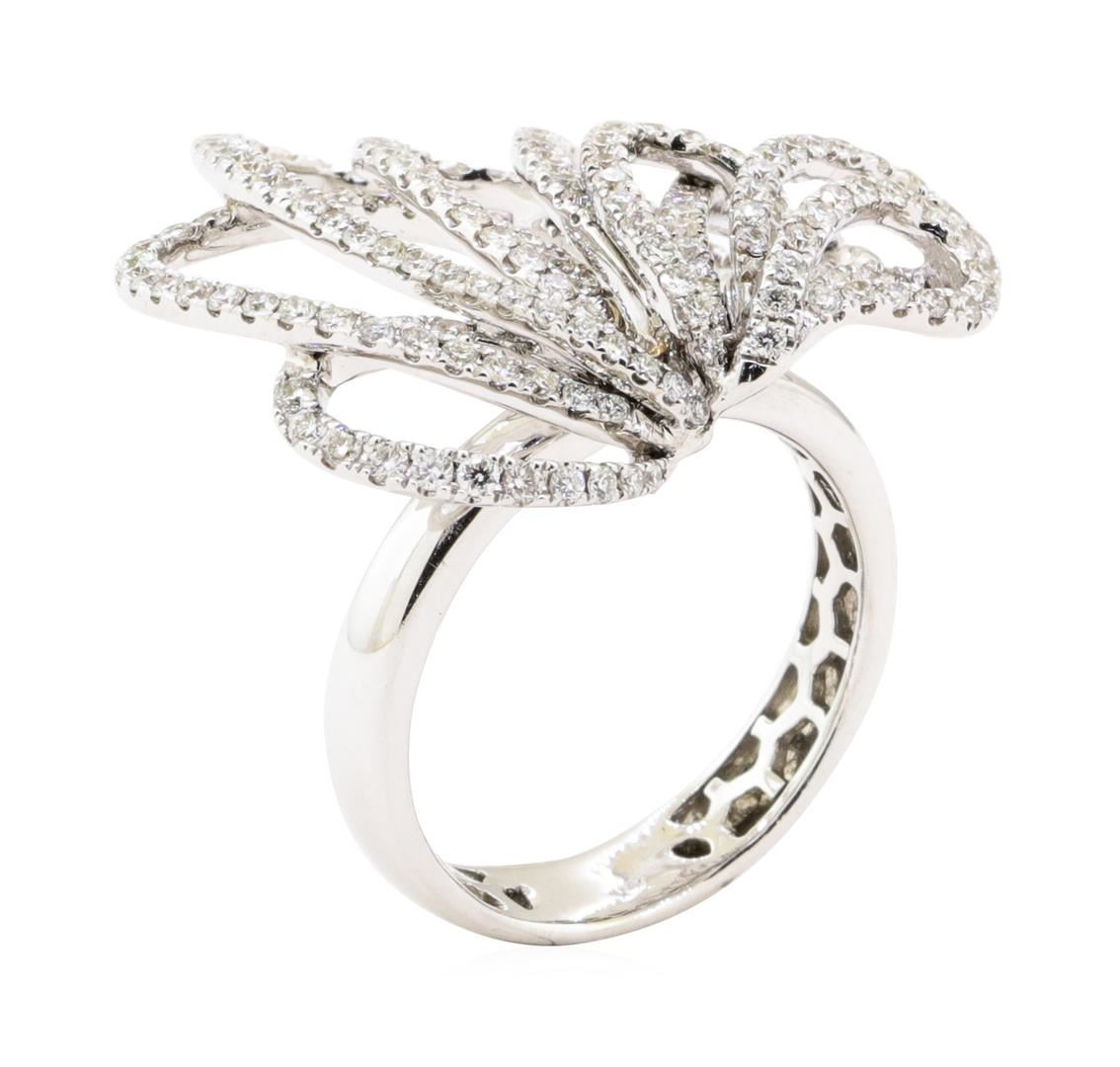 One electronically tested 14KT white gold lady's combination cast & assembled fashion ring with a reverse tapered shank with a bright polish finish. The featured lady's ring has nine interlocking loops and a shank measuring 4.30 millimeters wide. Identified with markings of '14K'. Condition is new, good workmanship. Containing: One Hundred Ninety-Nine prong set round brilliant cut diamonds, measuring 1.45 - 1.40 x 0.89mm (depth est.) approximate total weight of 199 Stones = 2.20 ct. Graded in the setting. Color G - I Clarity VS-1 to SI-1 Cut Very Good. Total Weight of Diamonds 2.20 ct.. Total Weight of Ring 9.00gm GAS Appraised at $8495.00. GAS Appraised.