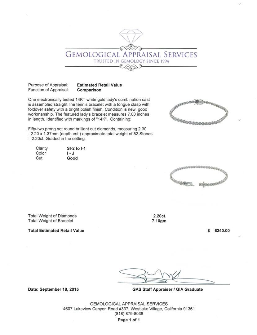 One electronically tested 14KT white gold lady's combination cast & assembled straight line tennis bracelet with a tongue clasp with foldover safety with a bright polish finish. The featured lady's bracelet measures 7.00 inches in length. Identified with markings of "14K". Condition is new, good workmanship. Containing: Fifty-Two prong set round brilliant cut diamonds, measuring 2.30 - 2.20 x 1.37mm (depth est.) approximate total weight of 52 Stones = 2.20ct. Graded in the setting. Clarity: SI-2 to I-1. Color: I - Good. Total Weight of Diamonds 2.20ct. Total Weight of Bracelet 7.10gm. GAS Appraised at $6,240.00.