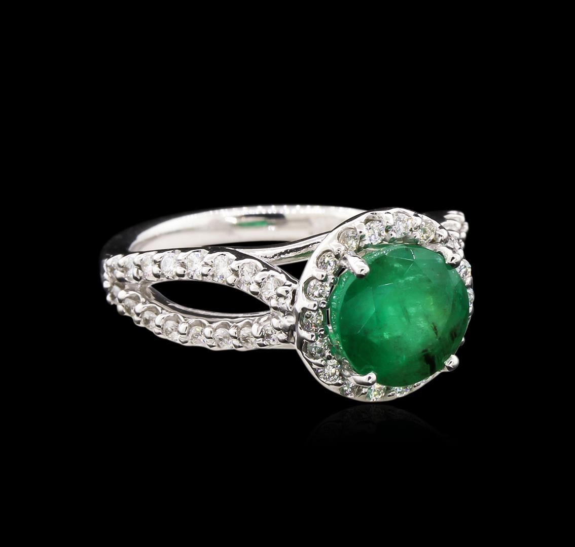 One electronically tested 14KT white gold lady's cast fashion ring with a halo with a bright polish finish. The featured ring has a shank measuring 2.10 millimeters in width. Identified with markings of "14K". Condition is new, good workmanship. Containing: One prong set round modified brilliant cut natural emerald, measuring 8.07 - 8.02 x 6.15 mm, approximate weight of 2.20ct., clarity is heavily included, type III, medium dark, moderately strong, green color, (GIA G 6/4), cut is good. Transmitting light somewhat diffusely, semi-transparent to translucent. Naturally occurring internal & external characteristics are present. Indications of oil residue. Graded in the setting. Sixty-Six prong set round brilliant cut diamonds, measuring 1.40 - 1.35 x 0.90mm (depth est.) approximate total weight of 66 Stones = 0.69ct. Graded in the setting. Clarity: VS-2 to SI-2. Color: G - I. Cut Good. Total Weight of Colored Stones 2.20ct. Total Weight of Diamonds 0.69ct. Total Weight of Ring 5.90gm. GAS Appraised at $4,980.00.