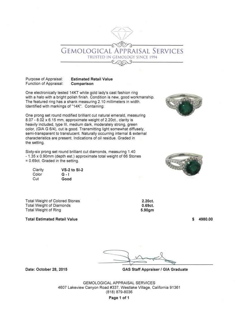 One electronically tested 14KT white gold lady's cast fashion ring with a halo with a bright polish finish. The featured ring has a shank measuring 2.10 millimeters in width. Identified with markings of "14K". Condition is new, good workmanship. Containing: One prong set round modified brilliant cut natural emerald, measuring 8.07 - 8.02 x 6.15 mm, approximate weight of 2.20ct., clarity is heavily included, type III, medium dark, moderately strong, green color, (GIA G 6/4), cut is good. Transmitting light somewhat diffusely, semi-transparent to translucent. Naturally occurring internal & external characteristics are present. Indications of oil residue. Graded in the setting. Sixty-Six prong set round brilliant cut diamonds, measuring 1.40 - 1.35 x 0.90mm (depth est.) approximate total weight of 66 Stones = 0.69ct. Graded in the setting. Clarity: VS-2 to SI-2. Color: G - I. Cut Good. Total Weight of Colored Stones 2.20ct. Total Weight of Diamonds 0.69ct. Total Weight of Ring 5.90gm. GAS Appraised at $4,980.00.