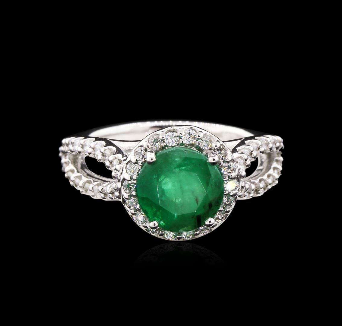 One electronically tested 14KT white gold lady's cast fashion ring with a halo with a bright polish finish. The featured ring has a shank measuring 2.10 millimeters in width. Identified with markings of "14K". Condition is new, good workmanship. Containing: One prong set round modified brilliant cut natural emerald, measuring 8.07 - 8.02 x 6.15 mm, approximate weight of 2.20ct., clarity is heavily included, type III, medium dark, moderately strong, green color, (GIA G 6/4), cut is good. Transmitting light somewhat diffusely, semi-transparent to translucent. Naturally occurring internal & external characteristics are present. Indications of oil residue. Graded in the setting. Sixty-Six prong set round brilliant cut diamonds, measuring 1.40 - 1.35 x 0.90mm (depth est.) approximate total weight of 66 Stones = 0.69ct. Graded in the setting. Clarity: VS-2 to SI-2. Color: G - I. Cut Good. Total Weight of Colored Stones 2.20ct. Total Weight of Diamonds 0.69ct. Total Weight of Ring 5.90gm. GAS Appraised at $4,980.00.