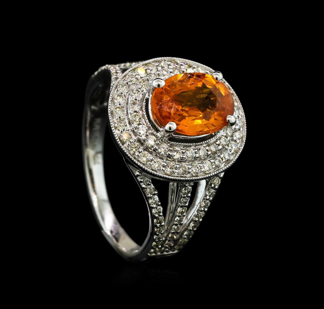 One electronically tested 14KT white gold lady's cast fashion ring with a split shank double halo with a bright polish with milgrain detailing finish. The featured lady's ring has a shank measuring 1.90 millimeters wide. Identified with markings of '14K'. Condition is new, good workmanship. Containing: One prong set oval modified mixed cut natural mandarin spessartite, measuring 9.03 x 6.73 x 4.15mm, (depth est.) approximate weight of 2.20ct., clarity is slightly included, medium, moderately strong, orange color, (GIA O 5/4), cut is good. Transmitting light with a minimum of distortion, transparent. Colored gemstones are presumed to have been subjected to commonly used enhancement processes. Graded in the setting. Forty-Eight prong set round brilliant cut diamonds, measuring 1.40 - 1.30 x 0.84mm (depth est.) approximate total weight of 48 Stones = 0.45ct. Graded in the setting. Clarity VS-2 to SI-1. Color: G - I Cut Very Good Fifty prong set round brilliant cut diamonds, measuring 1.10 - 1.00 x 0.63mm (depth est.) approximate total weight of 50 Stones = 0.20ct. Graded in the setting. Clarity VS-2 to SI-2. Color: G - H Cut Good. Total Weight of Colored Stones 2.20ct.. Total Weight of Diamonds 0.65ct.. Total Weight of Ring 5.40gm GAS Appraised at $4,920.00.