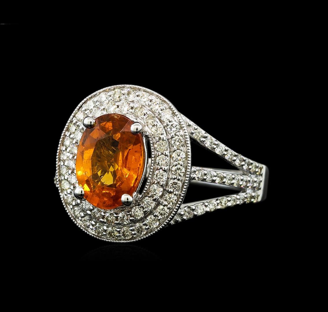 One electronically tested 14KT white gold lady's cast fashion ring with a split shank double halo with a bright polish with milgrain detailing finish. The featured lady's ring has a shank measuring 1.90 millimeters wide. Identified with markings of '14K'. Condition is new, good workmanship. Containing: One prong set oval modified mixed cut natural mandarin spessartite, measuring 9.03 x 6.73 x 4.15mm, (depth est.) approximate weight of 2.20ct., clarity is slightly included, medium, moderately strong, orange color, (GIA O 5/4), cut is good. Transmitting light with a minimum of distortion, transparent. Colored gemstones are presumed to have been subjected to commonly used enhancement processes. Graded in the setting. Forty-Eight prong set round brilliant cut diamonds, measuring 1.40 - 1.30 x 0.84mm (depth est.) approximate total weight of 48 Stones = 0.45ct. Graded in the setting. Clarity VS-2 to SI-1. Color: G - I Cut Very Good Fifty prong set round brilliant cut diamonds, measuring 1.10 - 1.00 x 0.63mm (depth est.) approximate total weight of 50 Stones = 0.20ct. Graded in the setting. Clarity VS-2 to SI-2. Color: G - H Cut Good. Total Weight of Colored Stones 2.20ct.. Total Weight of Diamonds 0.65ct.. Total Weight of Ring 5.40gm GAS Appraised at $4,920.00.