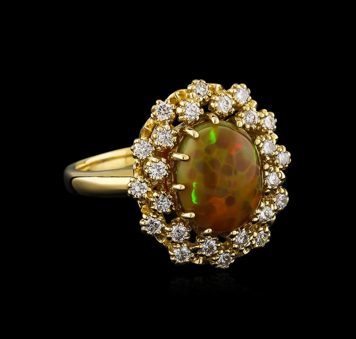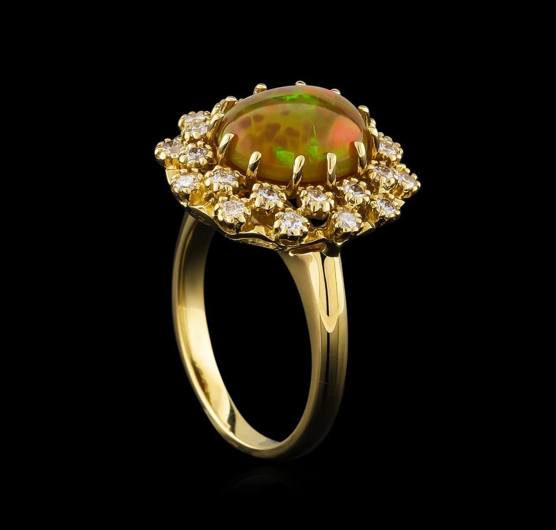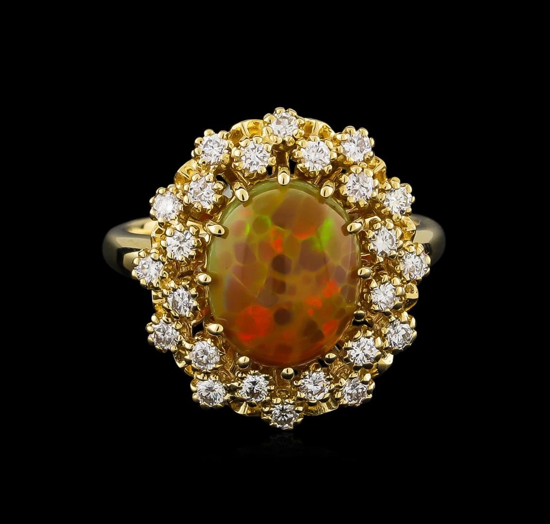 One electronically tested 14KT yellow gold lady's cast fashion ring with a double basket halo with a bright polish finish. The featured lady's ring has a shank measuring 2.27 millimeters wide. Identified with markings of "K14". Condition is new, good workmanship. Containing: One orange crystal that is cut in a oval shaped cabochon and is prong set, measuring 10.90 mm long x 9.10 mm wide, and 4.50 mm thick and the approximate weight is 2.20 carats. The opal has a somewhat bright, orange-green play of color (fire) in a rolling flashfire pattern; a medium dome; a good cut; slightly included; consistent in its brightness and pattern; and is not directional. Graded in the setting. Twenty-Four prong set round brilliant cut diamonds, measuring 1.95 - 1.85 x 1.18mm (depth est.) approximate total weight of 24 Stones = 0.62ct. Graded in the setting. Clarity: SI-1 to SI-2. Color: G - Good. Total Weight of Diamonds 0.62ct. Total Weight of Opals 2.20ct. Total Weight of Ring 7.30gm. GAS Appraised at $3,120.00.