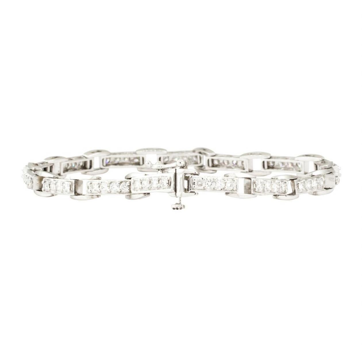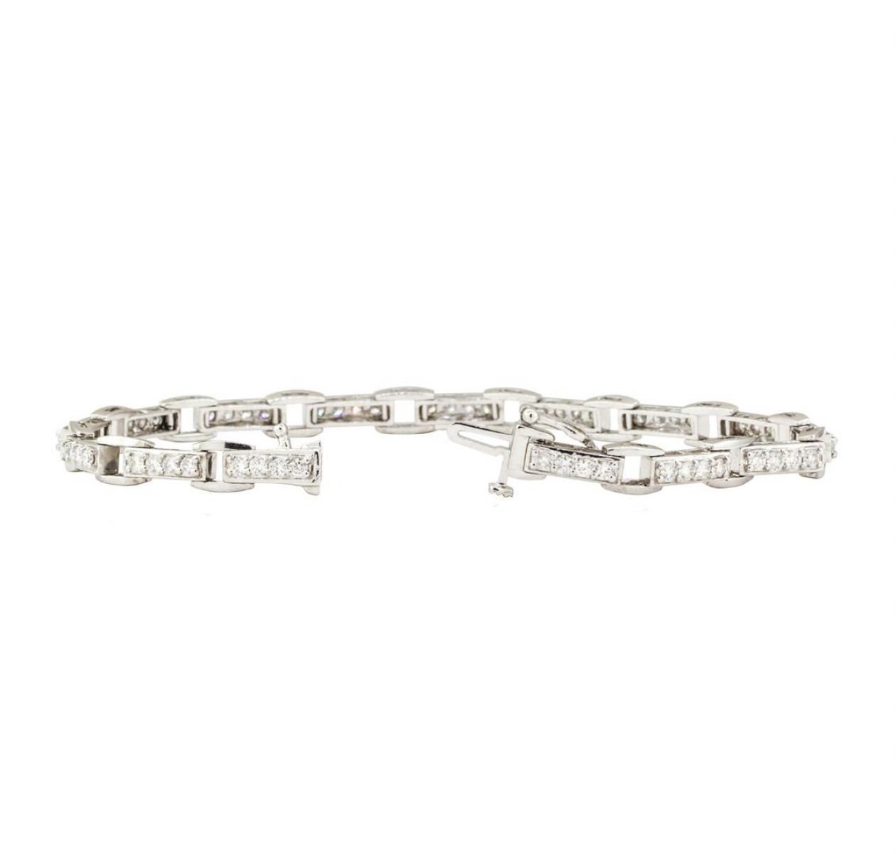One electronically tested 14KT white gold lady's combination cast & assembled fashion station tennis bracelet with a tongue clasp & foldover safety with a bright polish finish. The featured lady's bracelet measures 7.5 inches in length. Identified with markings of '14K'. Condition is new, good workmanship. Containing: Sixty prong set round brilliant cut diamonds, measuring 2.20 - 2.15 x 1.29mm (depth est.) approximate total weight of 60 Stones = 2.20ct. Graded in the setting. Color H - I Clarity SI-1 to SI-2 Cut Very Good. Total Weight of Diamonds 2.20ct.. Total Weight of Tennis Bracelet 13.60gm GAS Appraised at $8000.00. GAS Appraised.