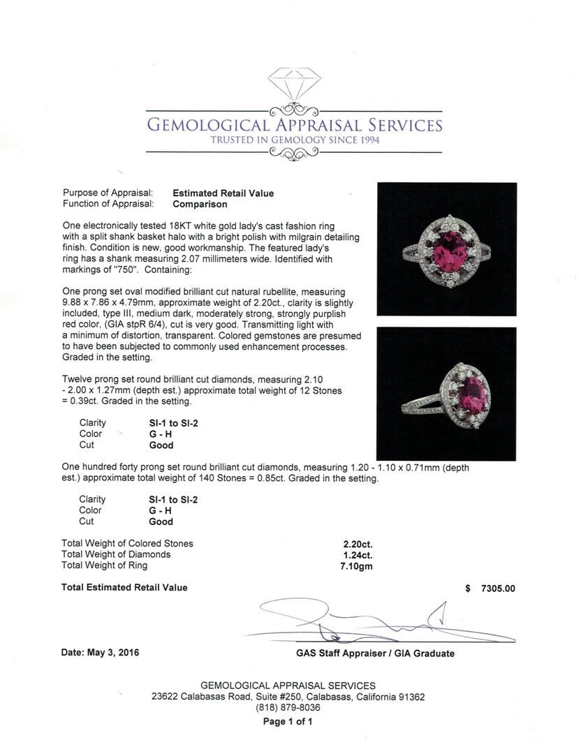 One electronically tested 18KT white gold lady's cast fashion ring with a split shank basket halo with a bright polish with milgrain detailing finish. The featured lady's ring has a shank measuring 2.07 millimeters wide. Identified with markings of "750". Condition is new, good workmanship. Containing: One prong set oval modified brilliant cut natural rubellite, measuring 9.88 x 7.86 x 4.79mm, approximate weight of 2.20ct., clarity is slightly included, type III, medium dark, moderately strong, strongly purplish red color, (GIA stpR 6/4), cut is very good. Transmitting light with a minimum of distortion, transparent. Colored gemstones are presumed to have been subjected to commonly used enhancement processes. Graded in the setting. Twelve prong set round brilliant cut diamonds, measuring 2.10 - 2.00 x 1.27mm (depth est.) approximate total weight of 12 Stones = 0.39ct. Graded in the setting. Clarity: SI-1 to SI-2. Color: G - Good One Hundred Forty prong set round brilliant cut diamonds, measuring 1.20 - 1.10 x 0.71mm (depth est.) approximate total weight of 140 Stones = 0.85ct. Graded in the setting. Clarity: SI-1 to SI-2. Color: G - Good. Total Weight of Colored Stones 2.20ct. Total Weight of Diamonds 1.24ct. Total Weight of Ring 7.10gm GAS Appraised at $7,305.00.