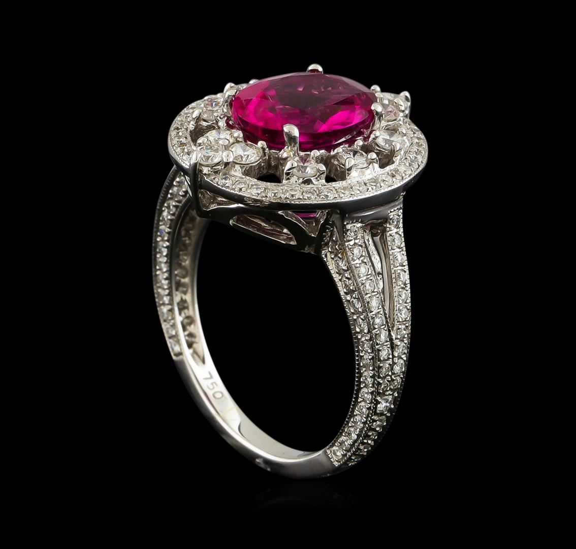 One electronically tested 18KT white gold lady's cast fashion ring with a split shank basket halo with a bright polish with milgrain detailing finish. The featured lady's ring has a shank measuring 2.07 millimeters wide. Identified with markings of "750". Condition is new, good workmanship. Containing: One prong set oval modified brilliant cut natural rubellite, measuring 9.88 x 7.86 x 4.79mm, approximate weight of 2.20ct., clarity is slightly included, type III, medium dark, moderately strong, strongly purplish red color, (GIA stpR 6/4), cut is very good. Transmitting light with a minimum of distortion, transparent. Colored gemstones are presumed to have been subjected to commonly used enhancement processes. Graded in the setting. Twelve prong set round brilliant cut diamonds, measuring 2.10 - 2.00 x 1.27mm (depth est.) approximate total weight of 12 Stones = 0.39ct. Graded in the setting. Clarity: SI-1 to SI-2. Color: G - Good One Hundred Forty prong set round brilliant cut diamonds, measuring 1.20 - 1.10 x 0.71mm (depth est.) approximate total weight of 140 Stones = 0.85ct. Graded in the setting. Clarity: SI-1 to SI-2. Color: G - Good. Total Weight of Colored Stones 2.20ct. Total Weight of Diamonds 1.24ct. Total Weight of Ring 7.10gm GAS Appraised at $7,305.00.