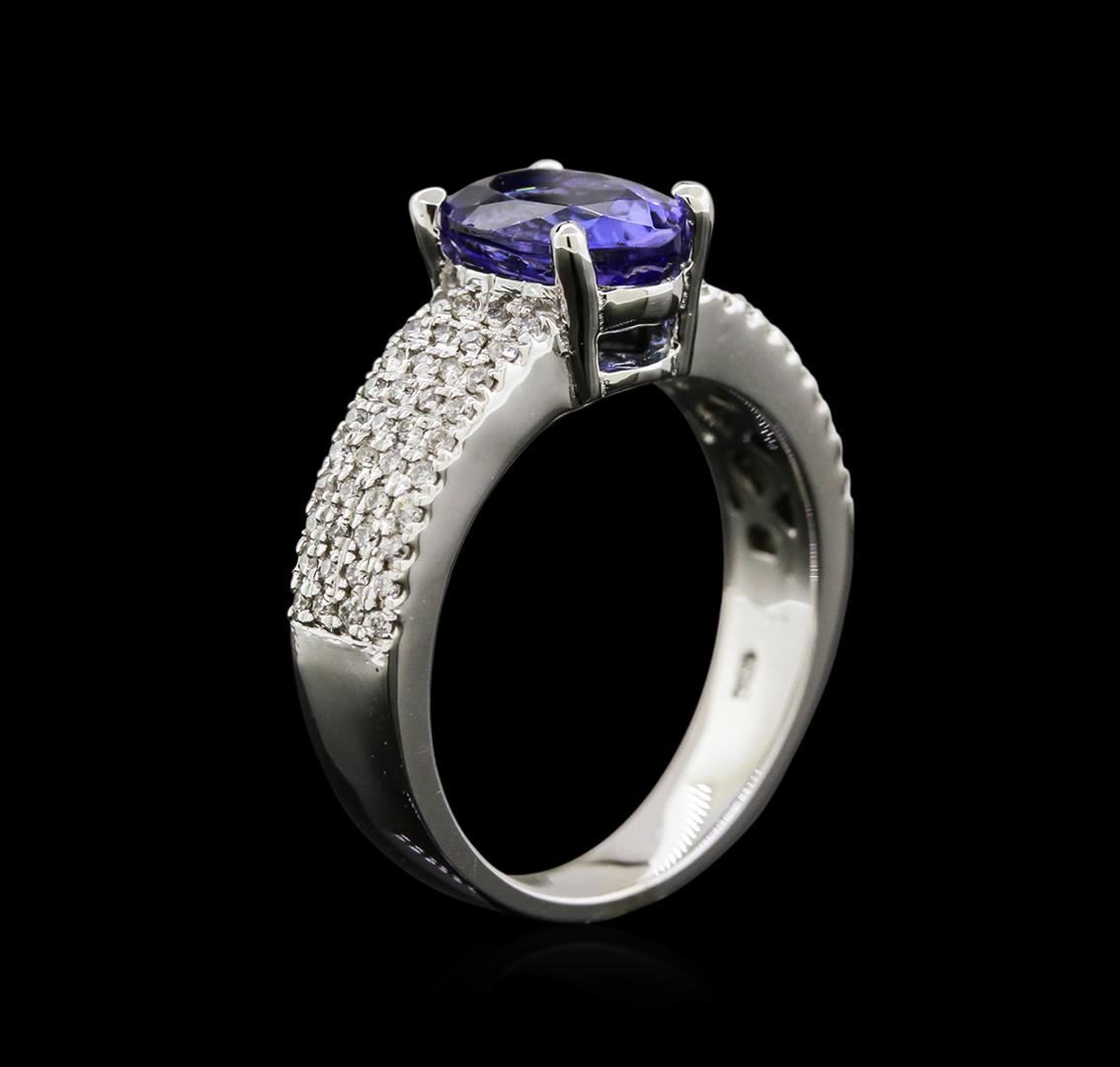 One electronically tested 14KT white gold lady's cast fashion ring with a cathedral shank with a bright polish finish. The featured ring has a 3.82mm shank Identified with markings of "K14". Condition is new, good workmanship. Containing: One prong set oval modified brilliant cut natural tanzanite, measuring 9.21 x 6.90 x 4.50mm, 8% bulge factor, approximate weight of 2.20ct., clarity is eye clean, type I, medium dark, very slightly grayish, bluish violet color, (GIA bV 6/3), cut is very good. Transmitting light with a minimum of distortion, transparent. Colored gemstones are presumed to have been subjected to commonly used enhancement processes. Graded in the setting. Eighty prong set round brilliant cut diamonds, measuring 1.10 - 0.95 x 0.67mm (depth est.) approximate total weight of 80 Stones = 0.35ct. Graded in the setting. Clarity: SI-1 to I-1. Color: H - I. Cut Good. Total Weight of Colored Stones 2.20ct. Total Weight of Diamonds 0.35ct. Total Weight of Ring 7.80gm. GAS Appraised at $6,670.00.