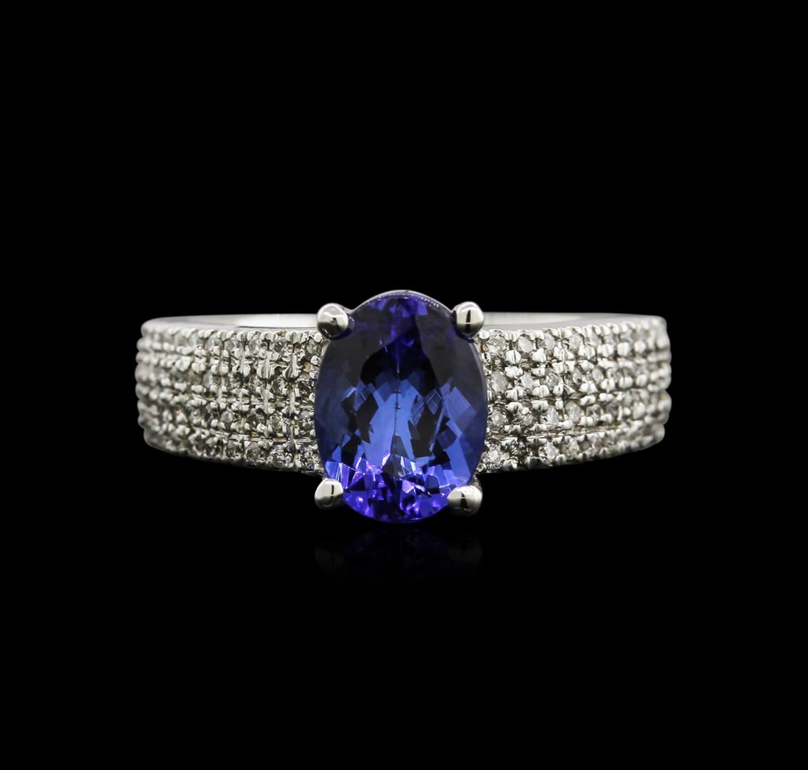 One electronically tested 14KT white gold lady's cast fashion ring with a cathedral shank with a bright polish finish. The featured ring has a 3.82mm shank Identified with markings of "K14". Condition is new, good workmanship. Containing: One prong set oval modified brilliant cut natural tanzanite, measuring 9.21 x 6.90 x 4.50mm, 8% bulge factor, approximate weight of 2.20ct., clarity is eye clean, type I, medium dark, very slightly grayish, bluish violet color, (GIA bV 6/3), cut is very good. Transmitting light with a minimum of distortion, transparent. Colored gemstones are presumed to have been subjected to commonly used enhancement processes. Graded in the setting. Eighty prong set round brilliant cut diamonds, measuring 1.10 - 0.95 x 0.67mm (depth est.) approximate total weight of 80 Stones = 0.35ct. Graded in the setting. Clarity: SI-1 to I-1. Color: H - I. Cut Good. Total Weight of Colored Stones 2.20ct. Total Weight of Diamonds 0.35ct. Total Weight of Ring 7.80gm. GAS Appraised at $6,670.00.