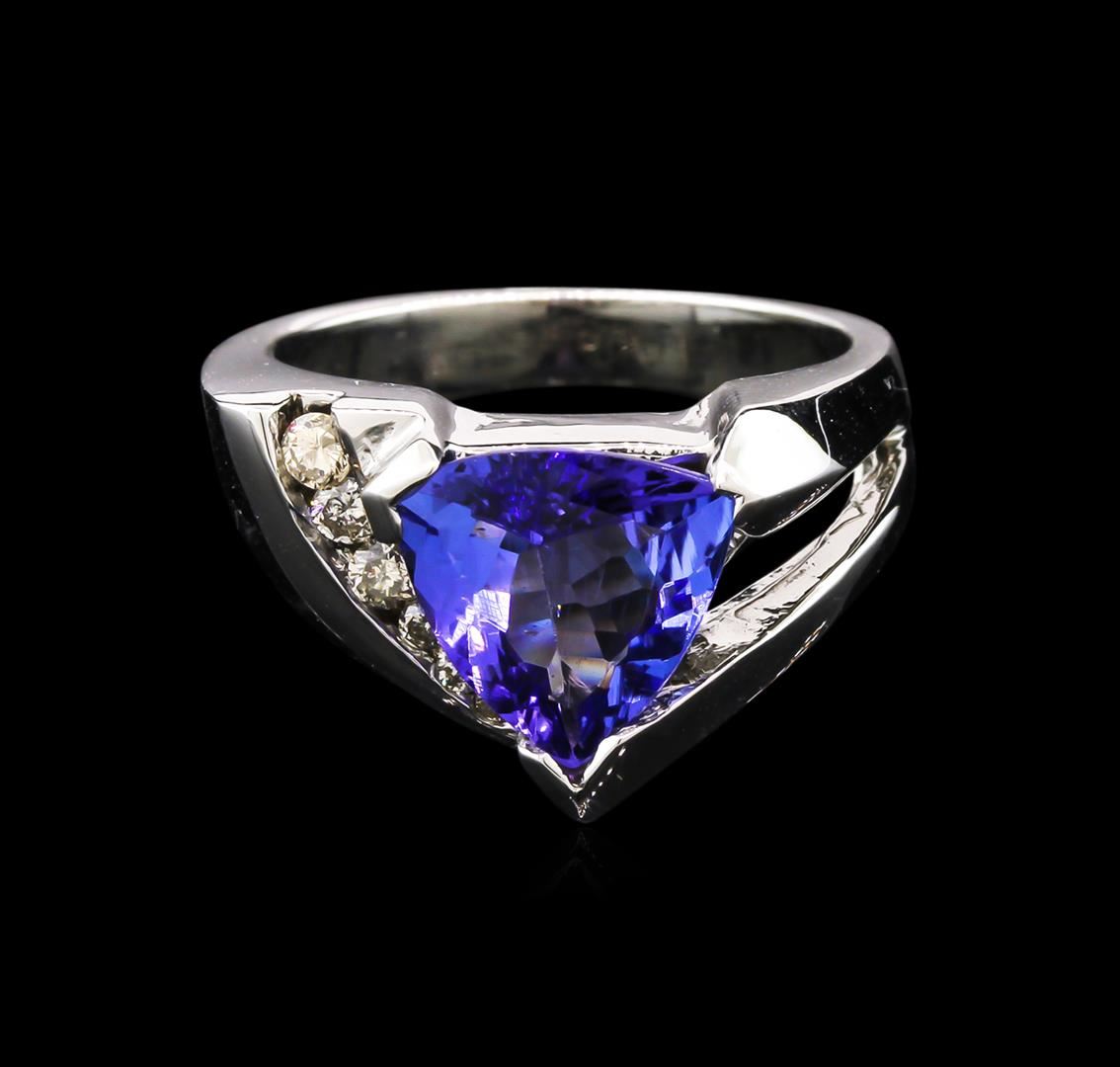 One electronically tested 14KT white gold lady's cast fashion ring with a tapered shank with a bright polish finish. The featured lady's ring has a shank measuring 3.23 millimeters wide. Identified with markings of "14K". Condition is new, good workmanship. Containing: One prong set triangle modified brilliant cut natural tanzanite, measuring 9.55 x 9.05 x 4.25mm, approximate weight of 2.20ct., clarity is eye clean, type I, medium, very slightly grayish, bluish violet color, (GIA bV 5/3), cut is good. Transmitting light with no distortion, transparent. Colored gemstones are presumed to have been subjected to commonly used enhancement processes. Graded in the setting. Three channel set round brilliant cut diamonds, measuring 2.10 - 2.05 x 1.35mm (depth est.) approximate total weight of 3 Stones = 0.11ct. Graded in the setting. Clarity: SI-2 to I-1. Color: H - I. Cut Good Three channel set round brilliant cut diamonds, measuring 1.55 - 1.50 x 0.99mm (depth est.) approximate total weight of 3 Stones = 0.04ct. Graded in the setting. Clarity: SI-2 to I-1. Color: H - I. Cut Good. Total Weight of Colored Stones 2.20ct. Total Weight of Diamonds 0.15ct. Total Weight of Ring 7.90gm. GAS Appraised at $4,640.00.