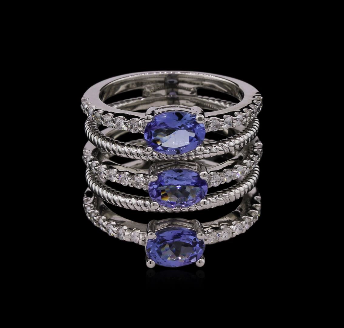 One electronically tested 14KT white gold lady's cast fashion ring with a wide band with a bright polish finish. The featured lady's ring has a five band motif and shank measuring 13.43 millimeters wide. Identified with markings of "K14". Condition is new, good workmanship. Containing: Three prong set oval modified brilliant cut natural tanzanites, measuring 6.93 x 4.91 x 3.10mm, approximate total weight of 2.20ct., clarity is eye clean, type I, medium light, very slightly grayish, bluish violet color, (GIA bV 4/3), cut is good. Transmitting light with no distortion, transparent. Colored gemstones are presumed to have been subjected to commonly used enhancement processes. Graded in the setting. Forty-Two prong set round brilliant cut diamonds, measuring 1.50 - 1.40 x 0.94mm (depth est.) approximate total weight of 42 Stones = 0.51ct. Graded in the setting. Clarity: SI-1 to I-1 . Color: H - I. Cut Good. Total Weight of Colored Stones 2.20ct.. Total Weight of Diamonds 0.51ct.. Total Weight of Ring 11.50gm at $ 4515.00 GAS Appraised.