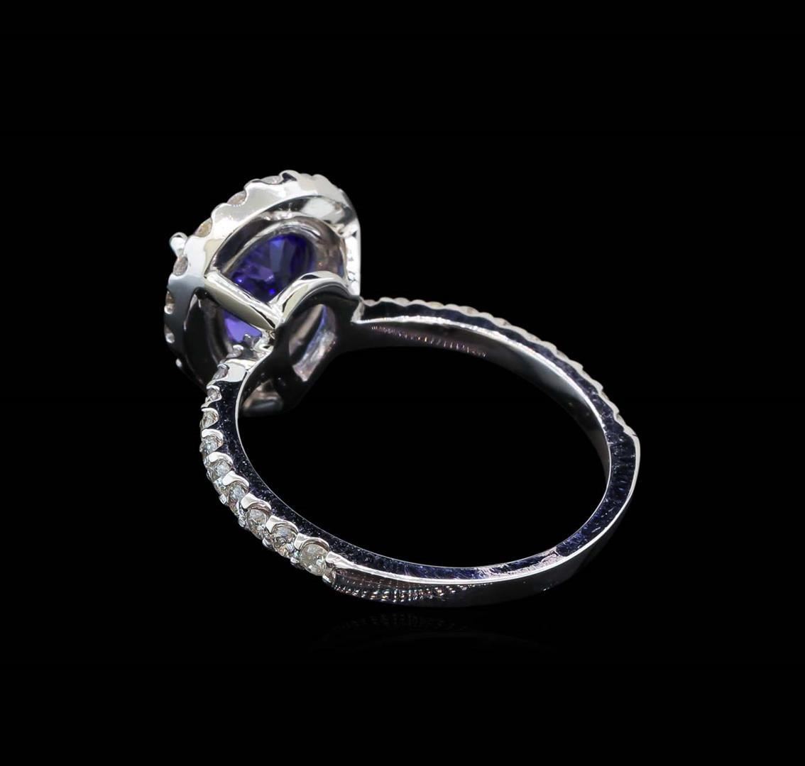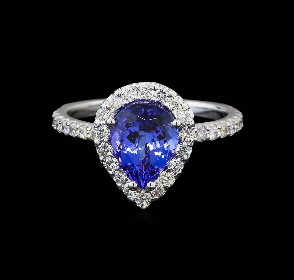 One electronically tested 14KT white gold lady's cast fashion ring with a basket halo with a bright polish finish. The featured lady's ring has a shank measuring 1.74 millimeters wide. Identified with markings of 'K14'. Condition is new, good workmanship. Containing: One prong set pear modified brilliant cut natural tanzanite, measuring 9.50 x 7.30 x 5.17mm, (depth est.) approximate weight of 2.20 ct., clarity is eye clean, medium dark, moderately strong, violetish blue color, (GIA vB 6/4), cut is very good. Transmitting light with no distortion, transparent. Colored gemstones are presumed to have been subjected to commonly used enhancement processes. Graded in the setting. Eighteen prong set round brilliant cut diamonds, measuring 1.90 - 1.80 x 1.11mm (depth est.) approximate total weight of 18 Stones = 0.42ct. Graded in the setting. Clarity SI-1 to SI-2. Color: H - I Cut Good Twenty prong set round brilliant cut diamonds, measuring 1.75 - 1.65 x 1.05mm (depth est.) approximate total weight of 20 Stones = 0.38ct. Graded in the setting. Clarity SI-1 to I-1. Color: H - I Cut Good. Total Weight of Colored Stones 2.20 ct.. Total Weight of Diamonds 0.80 ct.. Total Weight of Ring 3.50gm.