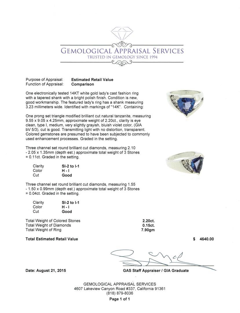 One electronically tested 14KT white gold lady's cast fashion ring with a tapered shank with a bright polish finish. The featured lady's ring has a shank measuring 3.23 millimeters wide. Identified with markings of "14K". Condition is new, good workmanship. Containing: One prong set triangle modified brilliant cut natural tanzanite, measuring 9.55 x 9.05 x 4.25mm, approximate weight of 2.20 ct., clarity is eye clean, type I, medium, very slightly grayish, bluish violet color, (GIA bV 5/3), cut is good. Transmitting light with no distortion, transparent. Colored gemstones are presumed to have been subjected to commonly used enhancement processes. Graded in the setting. Three channel set round brilliant cut diamonds, measuring 2.10 - 2.05 x 1.35mm (depth est.) approximate total weight of 3 Stones = 0.11ct. Graded in the setting. Clarity: SI-2 to I-1. Color: H - I. Cut Good Three channel set round brilliant cut diamonds, measuring 1.55 - 1.50 x 0.99mm (depth est.) approximate total weight of 3 Stones = 0.04ct. Graded in the setting. Clarity: SI-2 to I-1. Color: H - I. Cut Good. Total Weight of Colored Stones 2.20 ct. Total Weight of Diamonds 0.15ct. Total Weight of Ring 7.90gm. GAS Appraised.