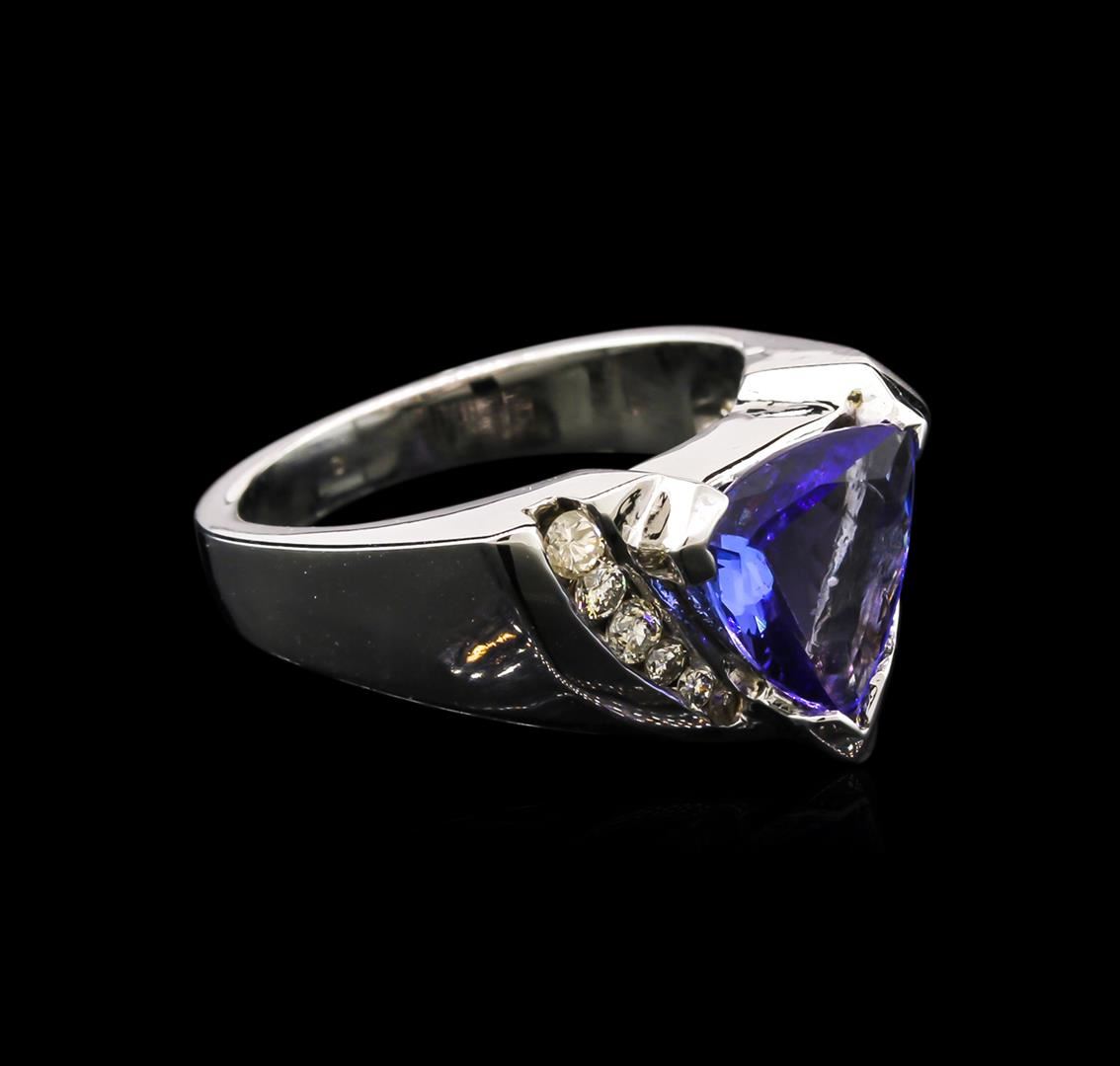 One electronically tested 14KT white gold lady's cast fashion ring with a tapered shank with a bright polish finish. The featured lady's ring has a shank measuring 3.23 millimeters wide. Identified with markings of "14K". Condition is new, good workmanship. Containing: One prong set triangle modified brilliant cut natural tanzanite, measuring 9.55 x 9.05 x 4.25mm, approximate weight of 2.20ct., clarity is eye clean, type I, medium, very slightly grayish, bluish violet color, (GIA bV 5/3), cut is good. Transmitting light with no distortion, transparent. Colored gemstones are presumed to have been subjected to commonly used enhancement processes. Graded in the setting. Three channel set round brilliant cut diamonds, measuring 2.10 - 2.05 x 1.35mm (depth est.) approximate total weight of 3 Stones = 0.11ct. Graded in the setting. Clarity: SI-2 to I-1. Color: H - I. Cut Good Three channel set round brilliant cut diamonds, measuring 1.55 - 1.50 x 0.99mm (depth est.) approximate total weight of 3 Stones = 0.04ct. Graded in the setting. Clarity: SI-2 to I-1. Color: H - I. Cut Good. Total Weight of Colored Stones 2.20ct. Total Weight of Diamonds 0.15ct. Total Weight of Ring 7.90gm. GAS Appraised at $4,640.00.
