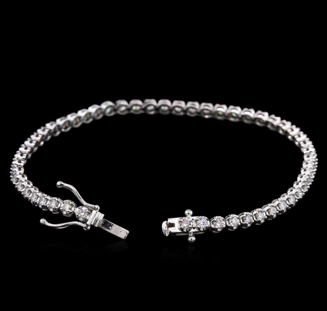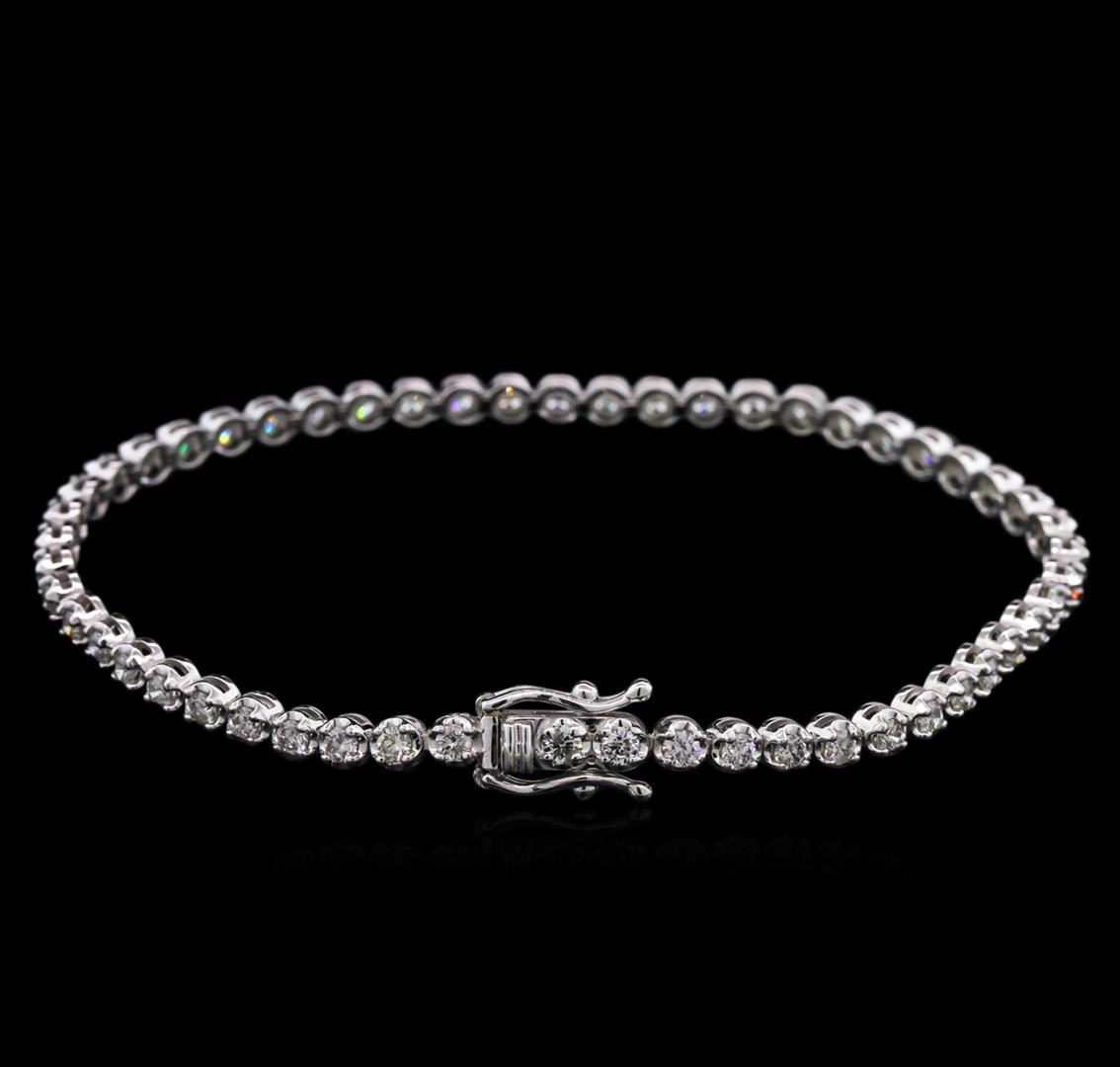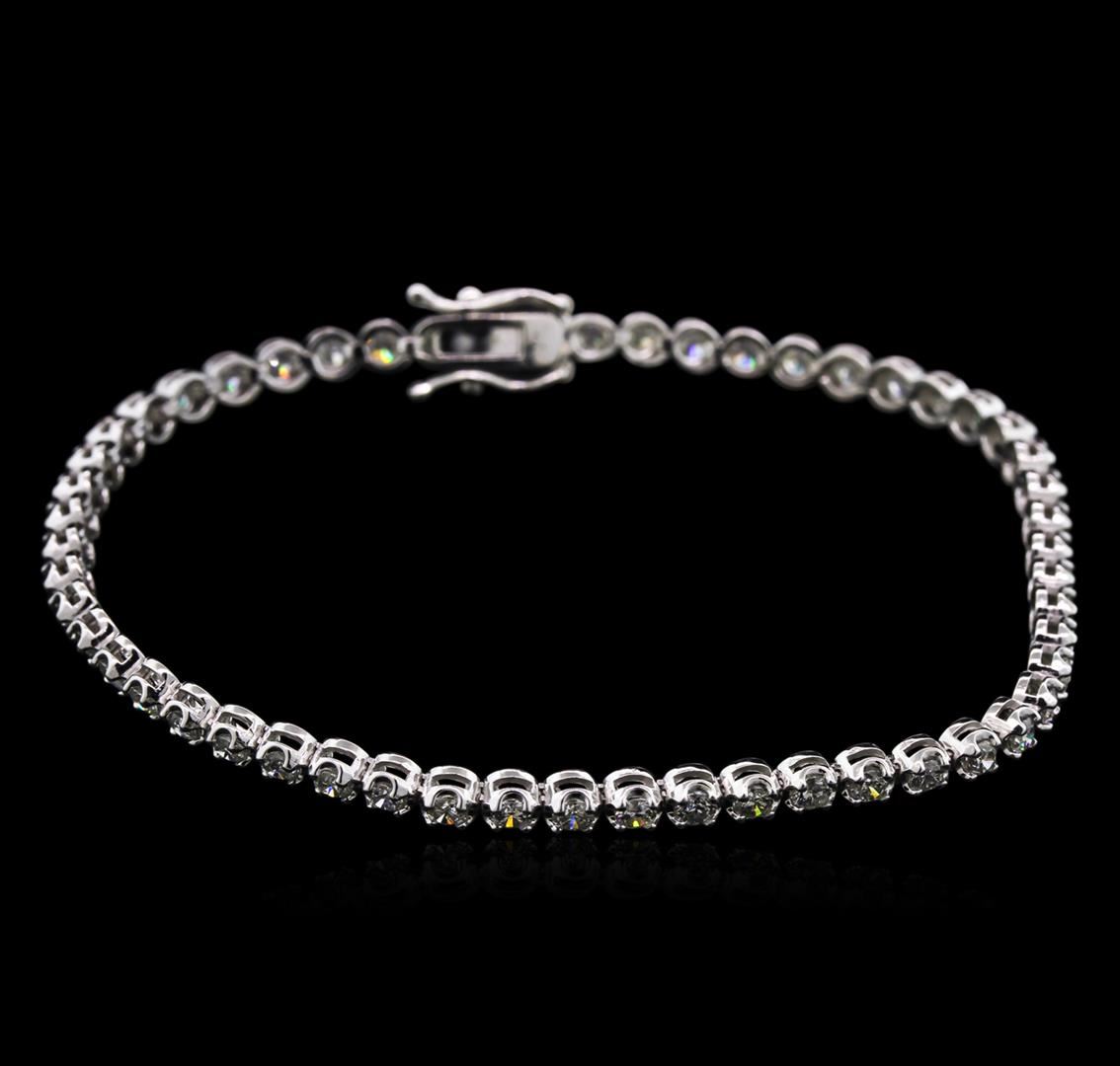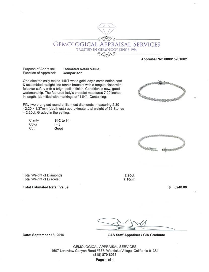One electronically tested 14KT white gold lady's combination cast & assembled straight line tennis bracelet with a tongue clasp with foldover safety with a bright polish finish. The featured lady's bracelet measures 7.00 inches in length. Identified with markings of "14K". Condition is new, good workmanship. Containing: Fifty-Two prong set round brilliant cut diamonds, measuring 2.30 - 2.20 x 1.37mm (depth est.) approximate total weight of 52 Stones = 2.20ct. Graded in the setting. Clarity: SI-2 to I-1. Color: I - Good. Total Weight of Diamonds 2.20ct. Total Weight of Bracelet 7.10gm. GAS Appraised at $6,240.00.