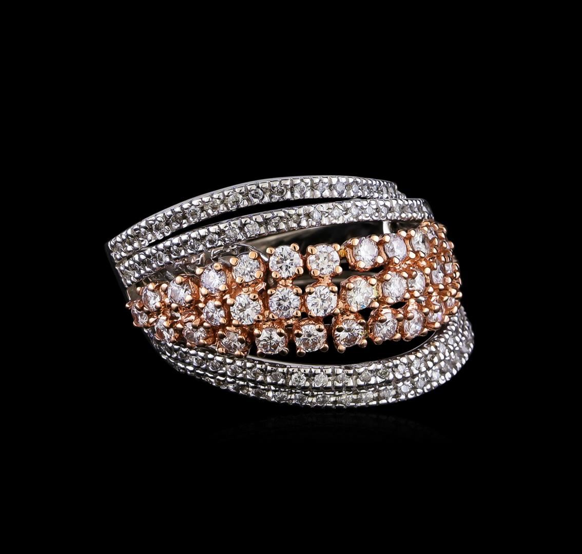 One electronically tested 14KT rose and white gold lady's combination cast & assembled fashion ring with a bright polish finish. The featured lady's ring has a 7 row wide band motif with a inter spring shank measuring 5.0 millimeters in width. Identified with markings of "14K". Condition is new, good workmanship. Containing: Thirty-Five prong set round brilliant cut diamonds, measuring 2.30 - 1.90 x 1.30mm (depth est.) approximate total weight of 35 Stones = 1.29ct. Graded in the setting. Clarity: SI-1 to SI-2. Color: G - Good Ninety prong set round brilliant cut diamonds, measuring 1.40 - 1.35 x 0.86mm (depth est.) approximate total weight of 90 Stones = 0.92ct. Graded in the setting. Clarity: SI-1 to I-1. Color: H - I. Cut Good. Total Weight of Diamonds 2.21ct. Total Weight of Ring 10.60gm. GAS Appraised at $6,630.00.
