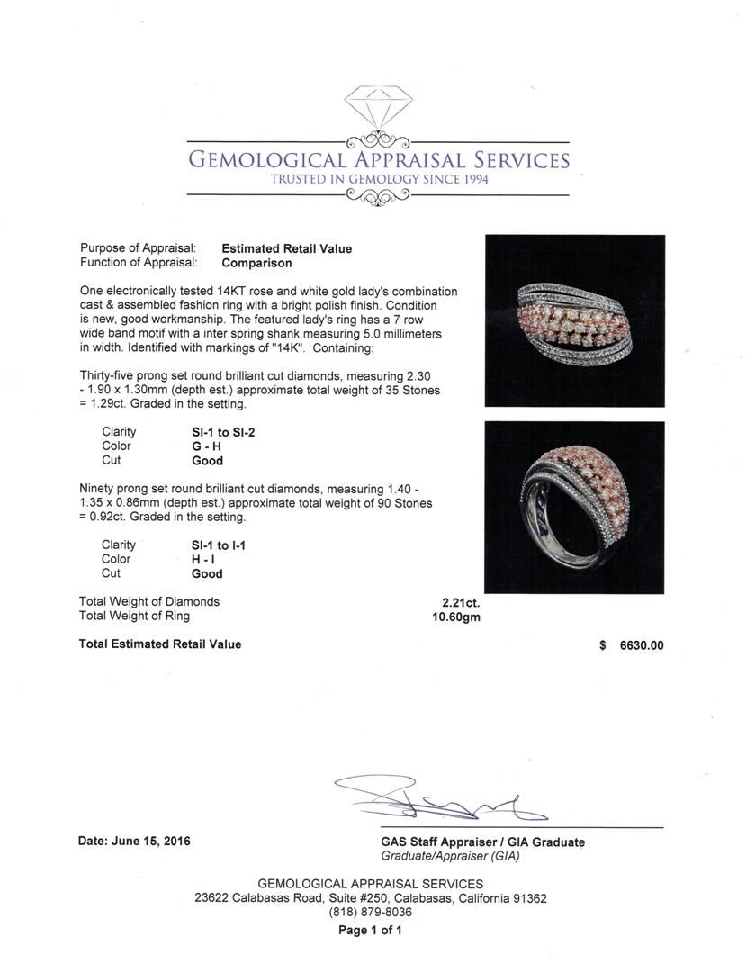 One electronically tested 14KT rose and white gold lady's combination cast & assembled fashion ring with a bright polish finish. The featured lady's ring has a 7 row wide band motif with a inter spring shank measuring 5.0 millimeters in width. Identified with markings of "14K". Condition is new, good workmanship. Containing: Thirty-Five prong set round brilliant cut diamonds, measuring 2.30 - 1.90 x 1.30mm (depth est.) approximate total weight of 35 Stones = 1.29ct. Graded in the setting. Clarity: SI-1 to SI-2. Color: G - Good Ninety prong set round brilliant cut diamonds, measuring 1.40 - 1.35 x 0.86mm (depth est.) approximate total weight of 90 Stones = 0.92ct. Graded in the setting. Clarity: SI-1 to I-1. Color: H - I. Cut Good. Total Weight of Diamonds 2.21ct. Total Weight of Ring 10.60gm. GAS Appraised at $6,630.00.