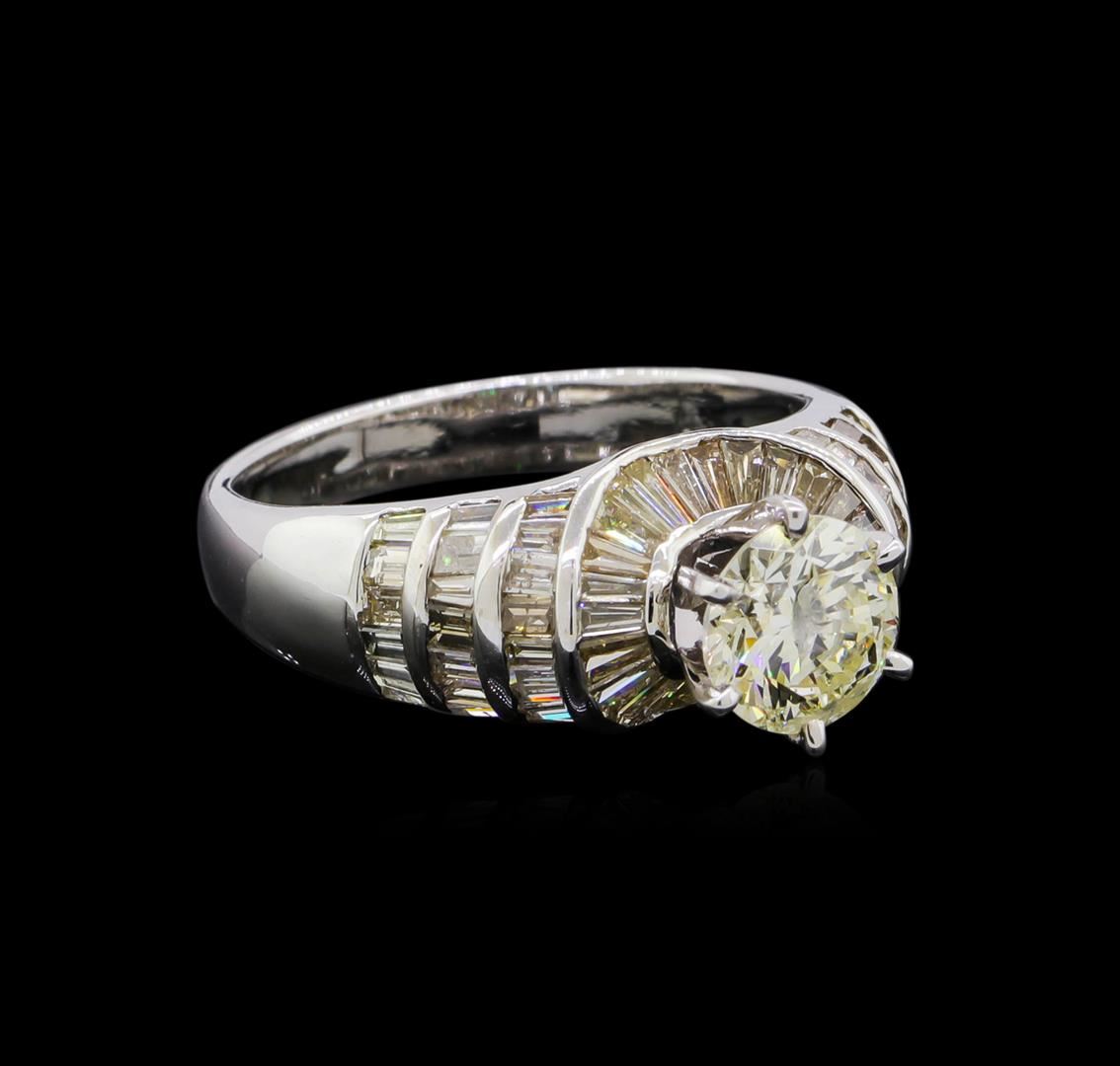 One electronically tested 18KT white gold ladies cast & assembled diamond unity ring. The featured diamond is set within a field of baguette cut diamonds, supported by tapering shoulders, completed by a three millimeter wide band. Identified with markings of "18K". Condition is new, good workmanship. Containing: One prong set round brilliant cut diamond, measuring 6.51 - 6.50 x 3.70mm (depth est.), 3.00.%. GTCF approximate weight of 1.02ct with a faint blue fluorescence. Graded in the setting. Clarity: I-2. Color: 56.8%. Table 58.4%. Sixty-Eight channel set baguette cut (tapered) diamonds (depth est.) approximate total weight of 68 Stones = 1.19ct. The color grade reflects the entire range of color for this group. Graded in the setting. Clarity: SI-1 to I-1. Color: H - L. Total Weight of Diamonds 2.21ct. Total Weight of Ring 4.85gm. AIG Appraised at $11,700.00.