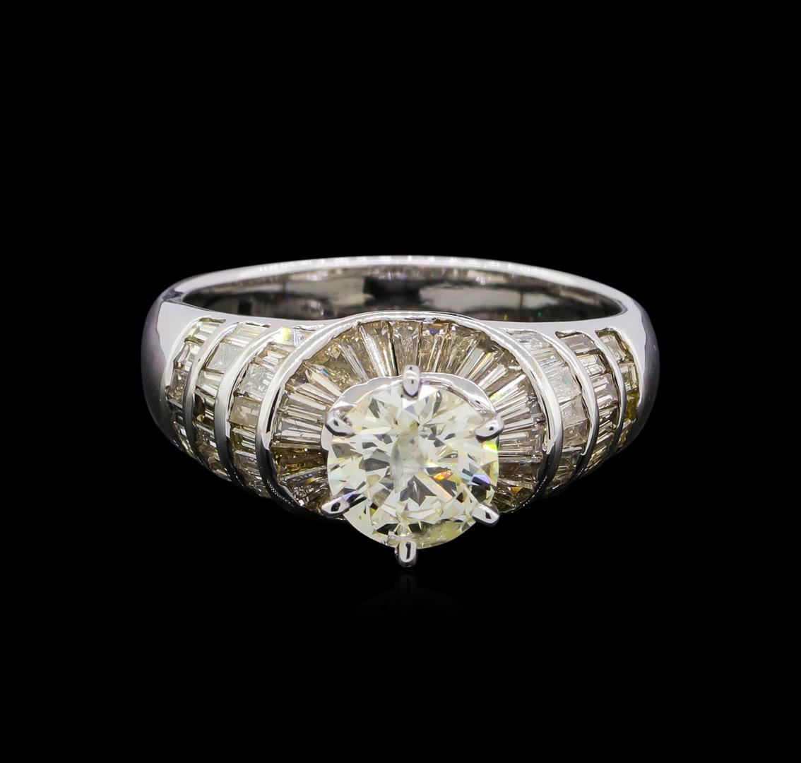 One electronically tested 18KT white gold ladies cast & assembled diamond unity ring. The featured diamond is set within a field of baguette cut diamonds, supported by tapering shoulders, completed by a three millimeter wide band. Identified with markings of "18K". Condition is new, good workmanship. Containing: One prong set round brilliant cut diamond, measuring 6.51 - 6.50 x 3.70mm (depth est.), 3.00.%. GTCF approximate weight of 1.02ct with a faint blue fluorescence. Graded in the setting. Clarity: I-2. Color: 56.8%. Table 58.4%. Sixty-Eight channel set baguette cut (tapered) diamonds (depth est.) approximate total weight of 68 Stones = 1.19ct. The color grade reflects the entire range of color for this group. Graded in the setting. Clarity: SI-1 to I-1. Color: H - L. Total Weight of Diamonds 2.21ct. Total Weight of Ring 4.85gm. AIG Appraised at $11,700.00.