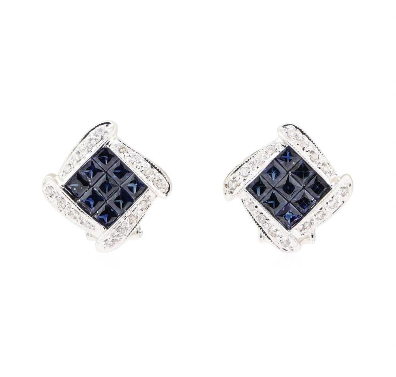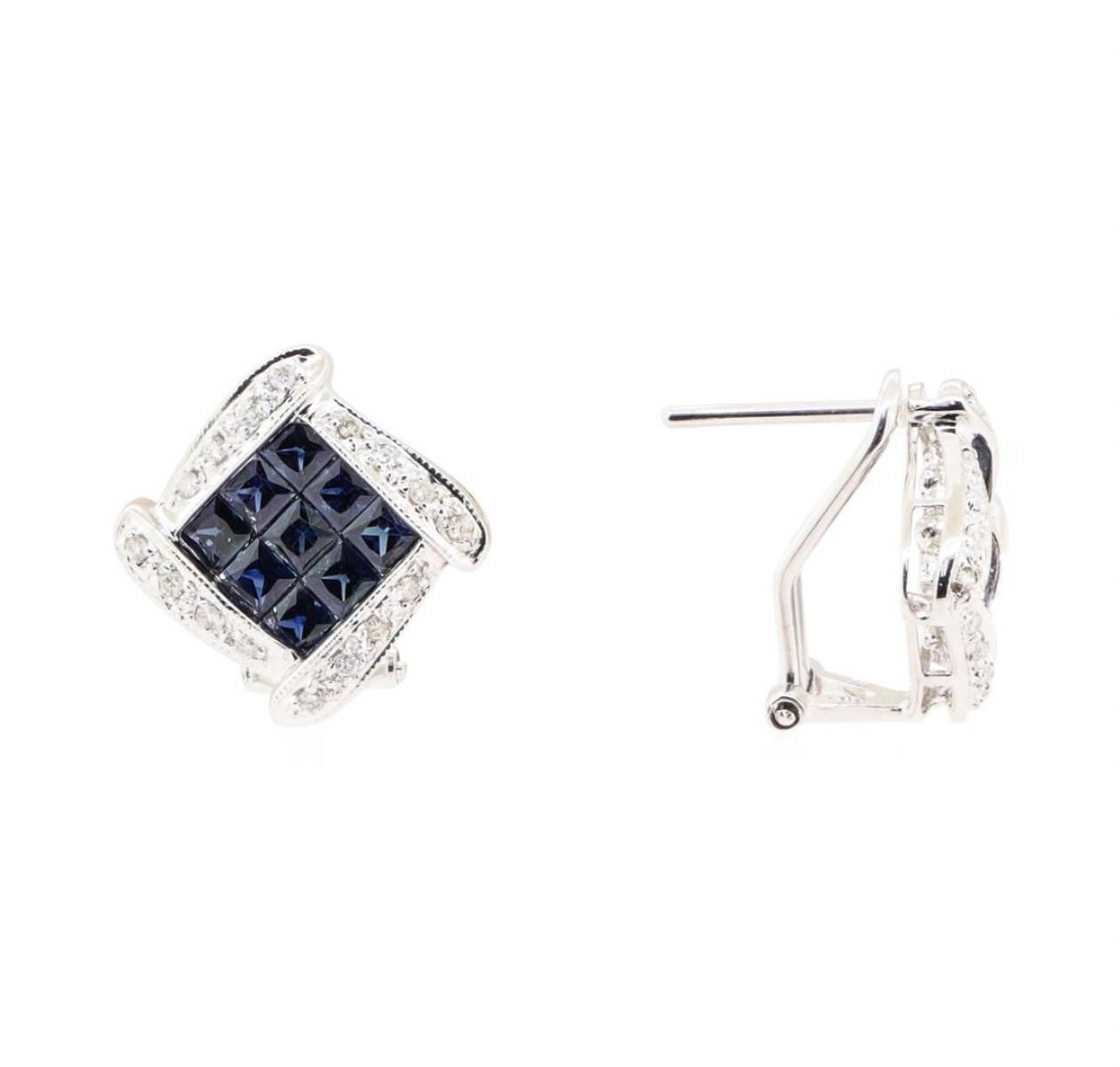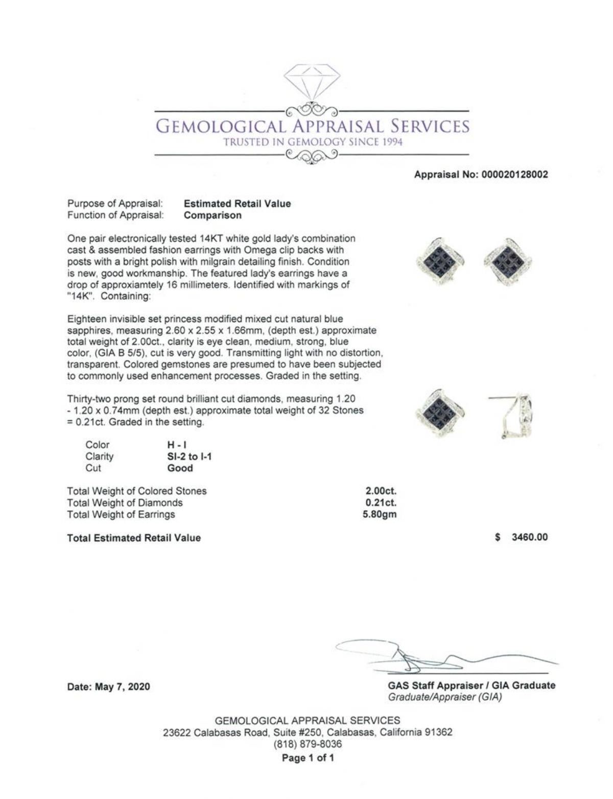 One pair electronically tested 14KT white gold lady's combination cast & assembled fashion earrings with Omega clip backs with posts with a bright polish with milgrain detailing finish. The featured lady's earrings have a drop of approxiamtely 16 millimeters. Identified with markings of '14K'. Condition is new, good workmanship. Containing: Eighteen invisible set princess modified mixed cut natural blue sapphires, measuring 2.60 x 2.55 x 1.66mm, (depth est.) approximate total weight of 2.00 ct., clarity is eye clean, medium, strong, blue color, (GIA B 5/5), cut is very good. Transmitting light with no distortion, transparent. Colored gemstones are presumed to have been subjected to commonly used enhancement processes. Graded in the setting. Thirty-Two prong set round brilliant cut diamonds, measuring 1.20 - 1.20 x 0.74mm (depth est.) approximate total weight of 32 Stones = 0.21ct. Graded in the setting. Color H - I Clarity SI-2 to I-1 Cut Good. Total Weight of Colored Stones 2.00 ct.. Total Weight of Diamonds 0.21ct.. Total Weight of Earrings 5.80gm GAS Appraised at $3460.00. GAS Appraised.