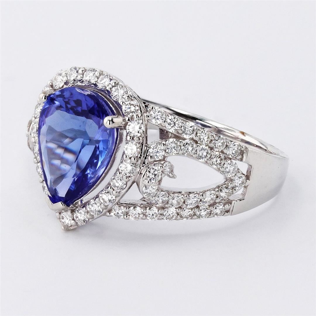 2.21ct Tanzanite and 0.74ctw Diamond 14K White Gold Ring. One polished, stamped, and tested 14K white gold ring with a bright finish. The ring is mounted with: 1 genuine tanzanite center stone weighing approximately 2.21 carat, and 77 genuine round diamonds weighing approximately 0.74 carats. This item weighs 3.6 grams, condition is new, excellent workmanship. MAIN GEMSTONE Species: Zoisite Variety: Tanzanite Shape: Pear Cutting Style: Modified Brilliant Cut Measurements: 9.7 x 8.2mm Weight: 2.21 carat Color: Bluish Violet Cut Grade: Very Good Refractive Index: 1.691 - 1.700 DR Birefringence: 0.008 - 0.013 Hardness: 6.5 - 7 ADJACENT GEMSTONES ON RING Identity: Natural Diamond Shape: Round Cutting Style: Brilliant Cut Quantity: 77 Diamonds Measurements: 1.3mm Total Weight: 0.74 carats Clarity Grade: VS2 to SI2 Color Grade: F - G Refractive Index: 2.418 Hardness: 10 TANZANITE WEIGHT: 2.21ct TOTAL DIAMOND WEIGHT: 0.74ctw WEIGHT OF ITEM: 3.6 grams GOLD CONTENT: 14K White Gold