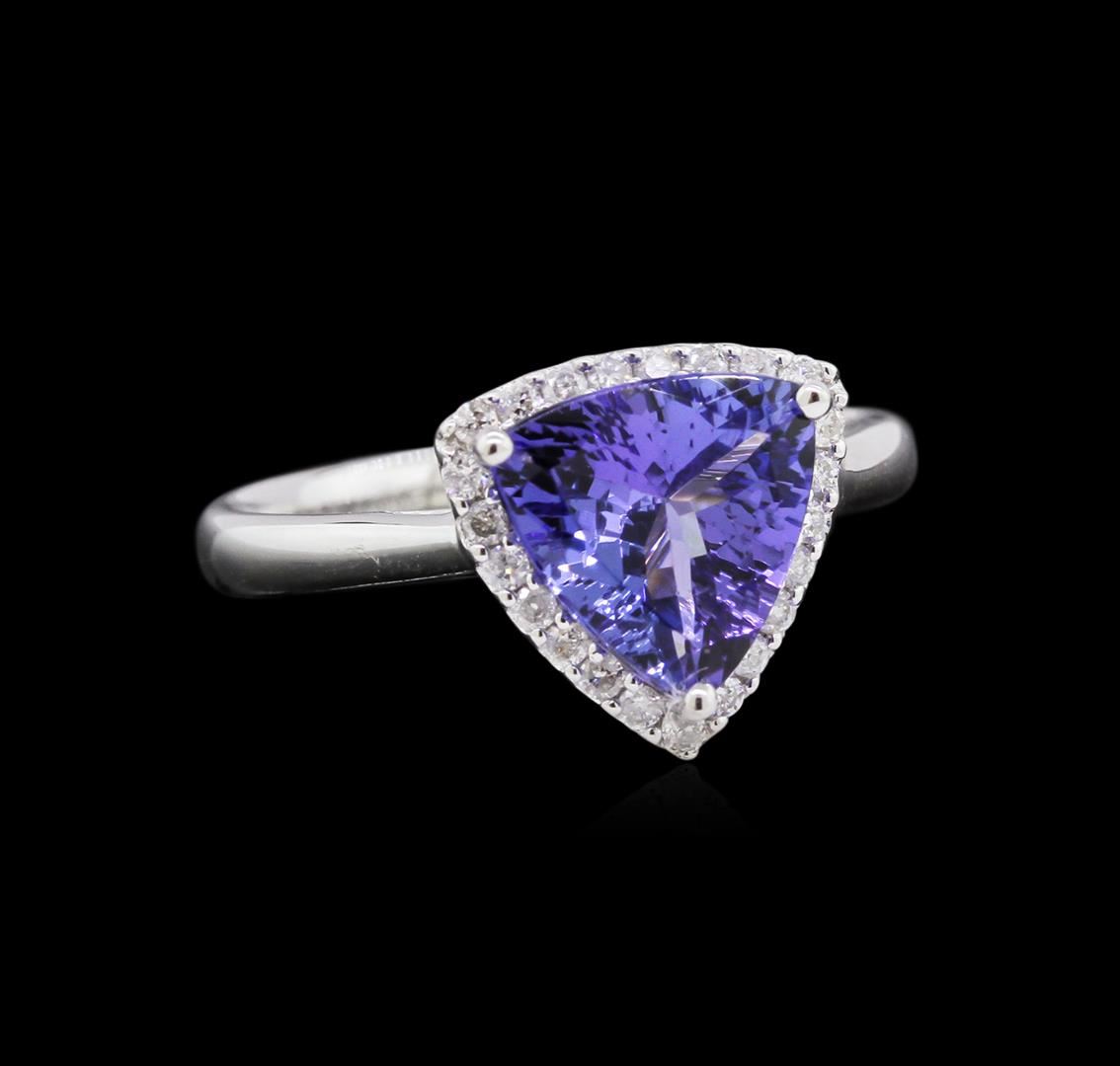 One 14KT white gold tanzanite and diamond ring. A trillion cut tanzanite zoisite gemstone is prong mounted in the center of the ring. Round brilliant cut diamonds accent the ring around the center gemstone and on both sides. The ring is cast stamped "14K" and has a gross weight of 3.2 Grams. Diamond(s): Shape: Round Brilliant Cut. Weight: 0.20 carat. Average Clarity: I1. Average Color: H-J. Symmetry: Very Good. Polish: Very Good. GemStone(s): Tanzanite Zoisite. Nature: Natural. Shape: Trillion, Faceted. Quantity: 1, Mounted. Weight: 2.21 carat. Dimensions: Length - 8.59 mm. ; Width - 7.73 mm. Bulge: Visible. Clarity: VS, Type 1. Color: Purplish Blue (4/4). Symmetry: Very Good. Color Intensity: Medium. Transparency: Transparent. Tone: Medium. Metal(s): Metal: Gold, Stamped. Purity: 14K. Color: White. Condition: Excellent. Finish: High polish. GGA Appraised at $5,245.00.