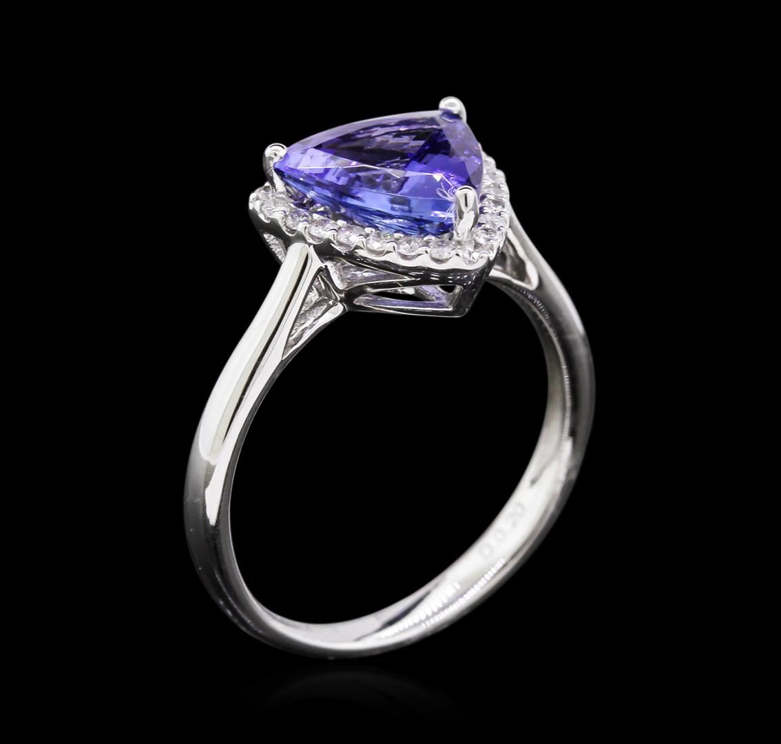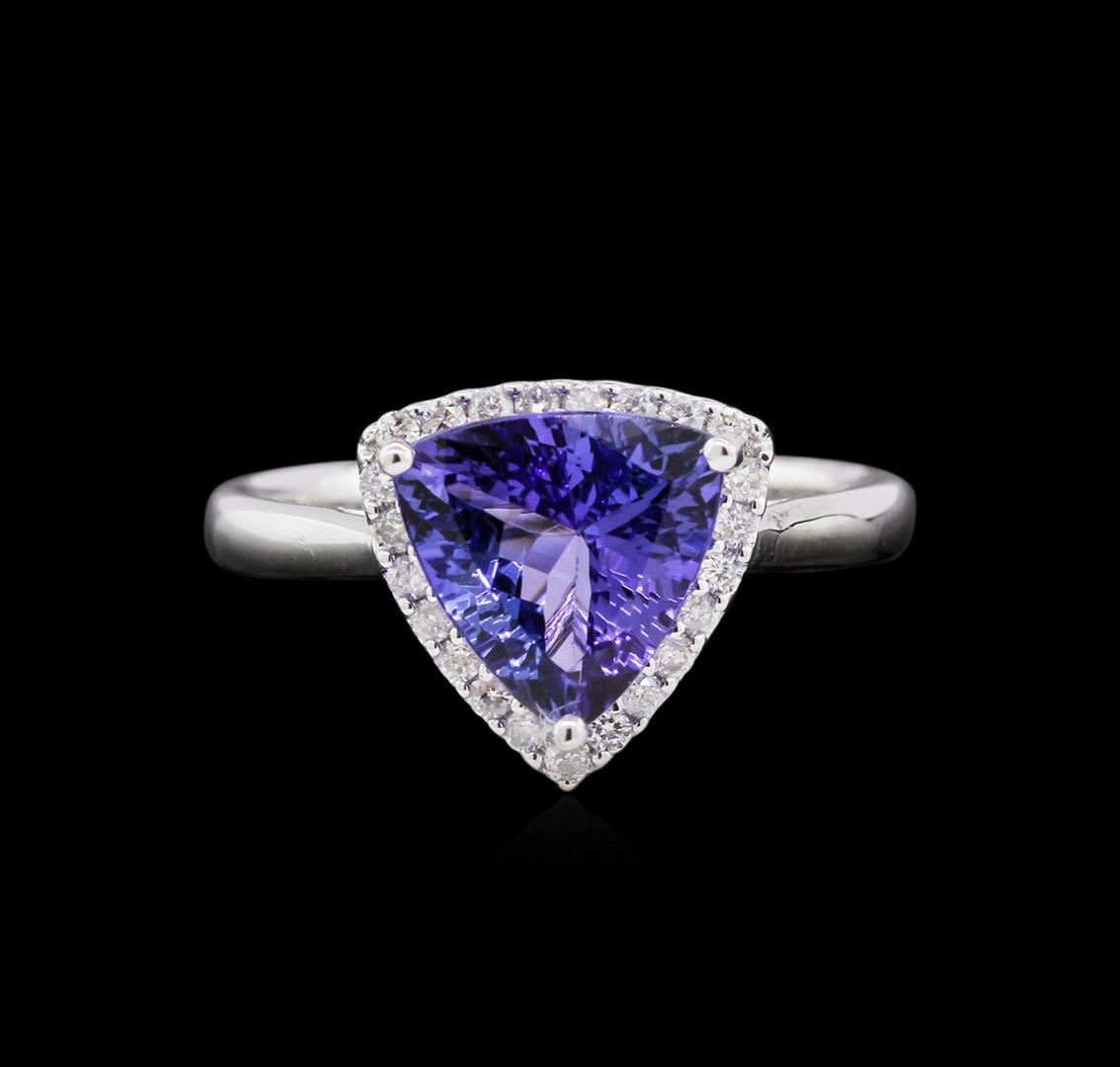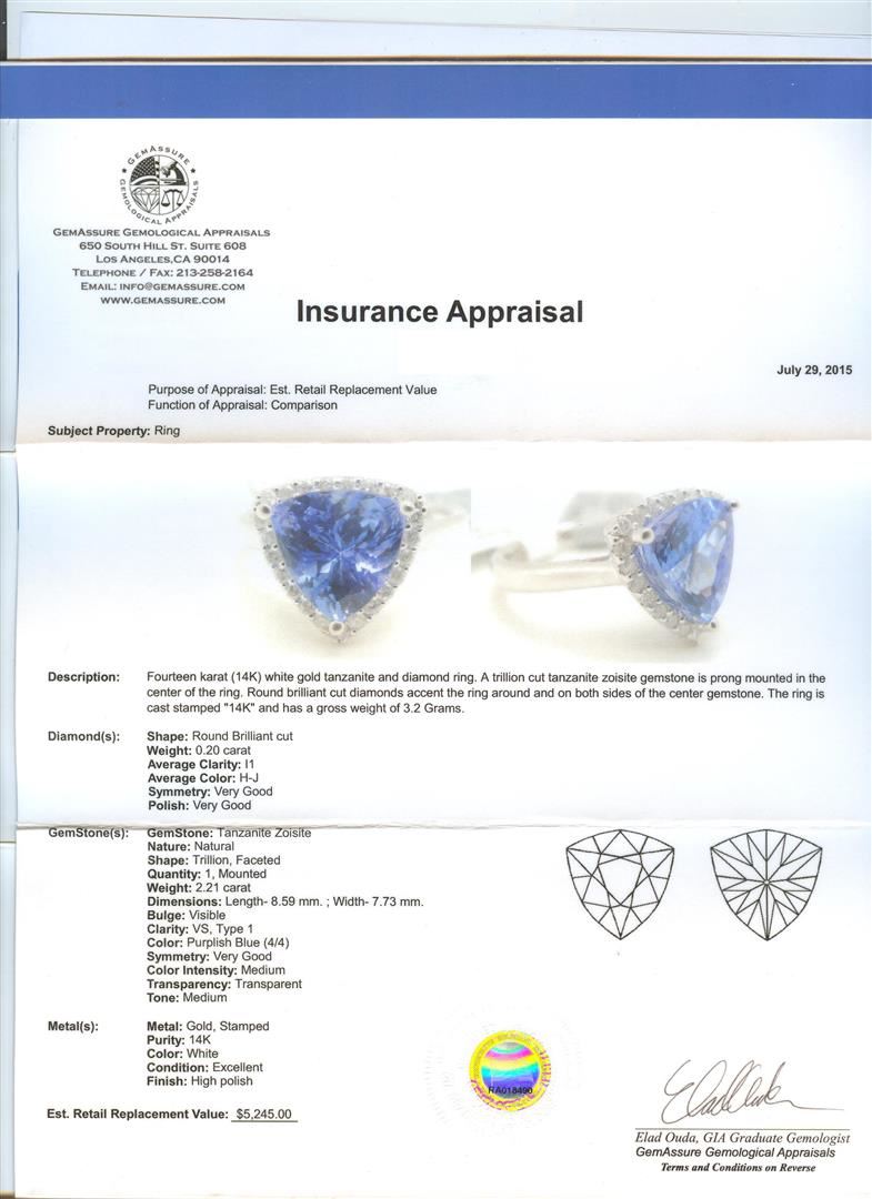 One 14KT white gold tanzanite and diamond ring. A trillion cut tanzanite zoisite gemstone is prong mounted in the center of the ring. Round brilliant cut diamonds accent the ring around the center gemstone and on both sides. The ring is cast stamped "14K" and has a gross weight of 3.2 Grams. Diamond(s): Shape: Round Brilliant Cut. Weight: 0.20 carat. Average Clarity: I1. Average Color: H-J. Symmetry: Very Good. Polish: Very Good. GemStone(s): Tanzanite Zoisite. Nature: Natural. Shape: Trillion, Faceted. Quantity: 1, Mounted. Weight: 2.21 carat. Dimensions: Length - 8.59 mm. ; Width - 7.73 mm. Bulge: Visible. Clarity: VS, Type 1. Color: Purplish Blue (4/4). Symmetry: Very Good. Color Intensity: Medium. Transparency: Transparent. Tone: Medium. Metal(s): Metal: Gold, Stamped. Purity: 14K. Color: White. Condition: Excellent. Finish: High polish. GGA Appraised at $5,245.00.